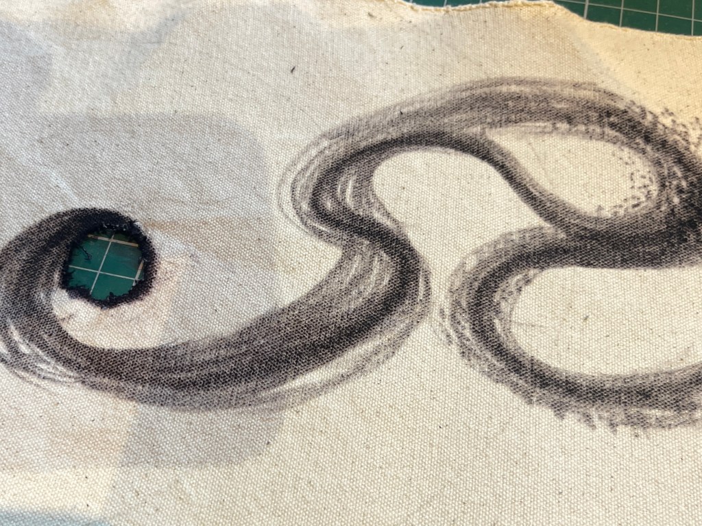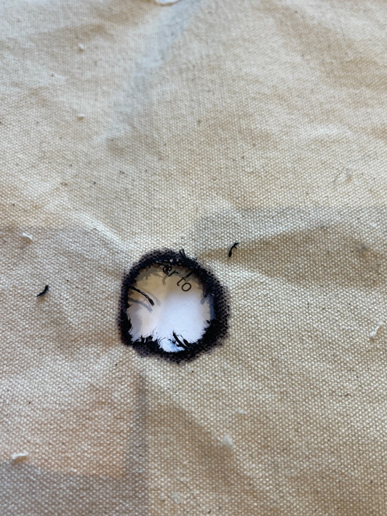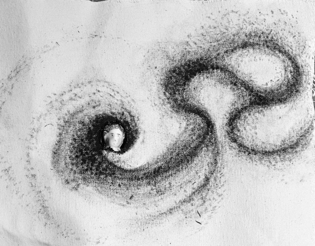 - using some old canvas I created the image with an additional black ‘burn’ hole .. denoting the epicentre of emotion: