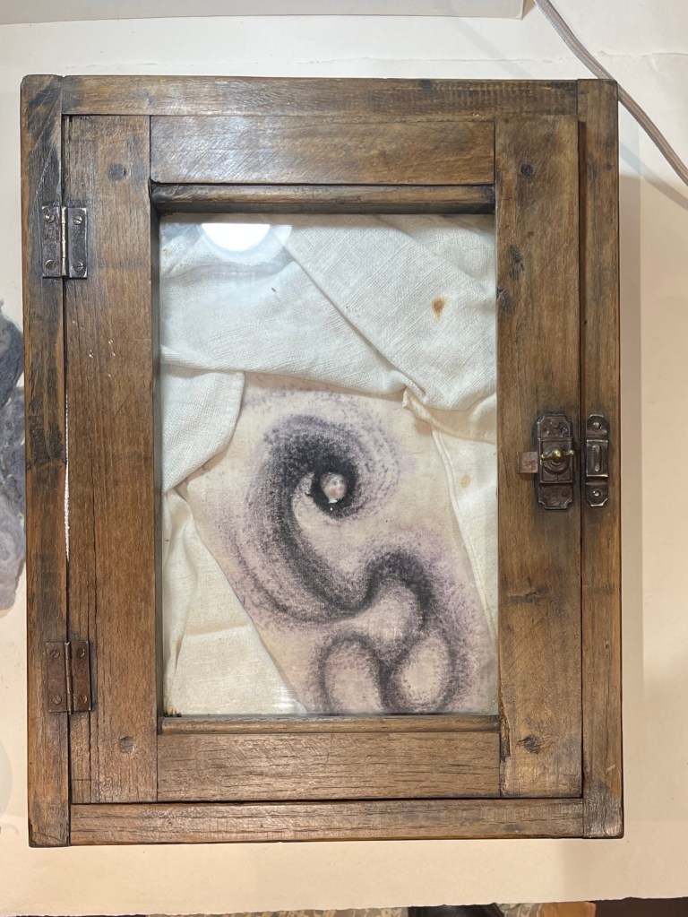I am also drawn to some inclusion of the object below.. I placed a number of vintage linen cloths used for domestic purposes with in it …and the murmuration image inside … it s not resolved but the feeling of enclose and inclusion was a new angle to explore … working with found objects … etc.
