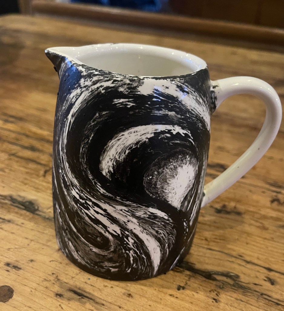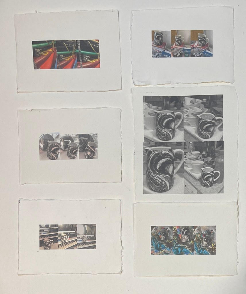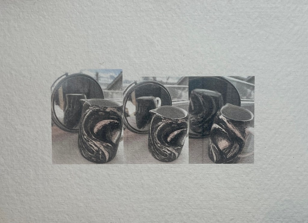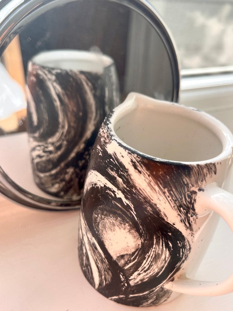 Wanting to place the image of Murmuration on to an every day object I painted a jug…It was an experimental process and a toe dip into this process. I used acrylic paint to recreate a sweeping 3D image surrounding its form…