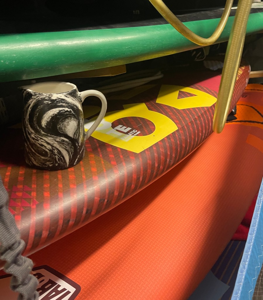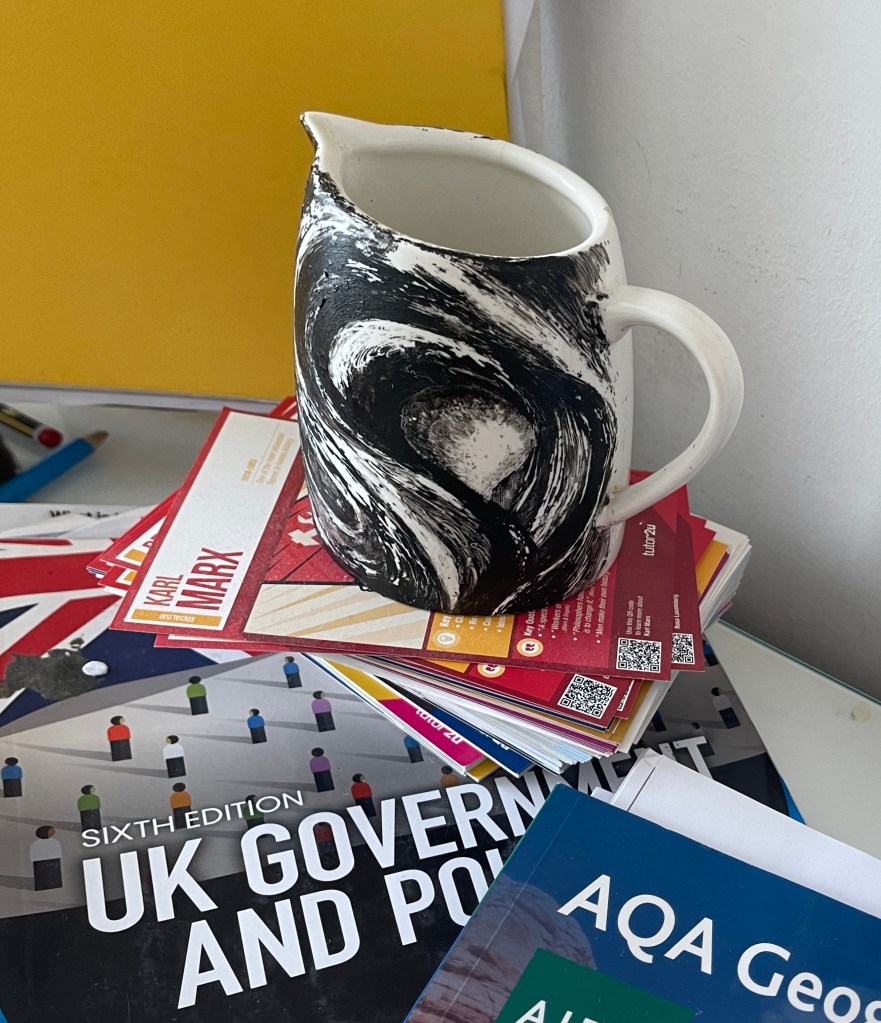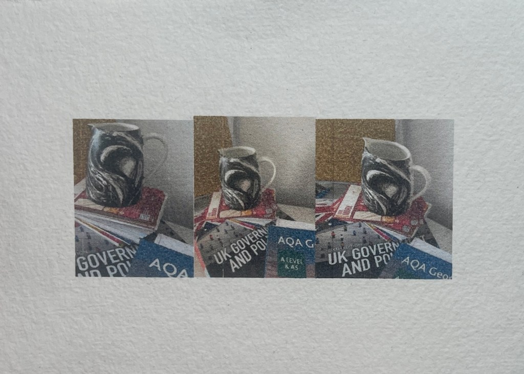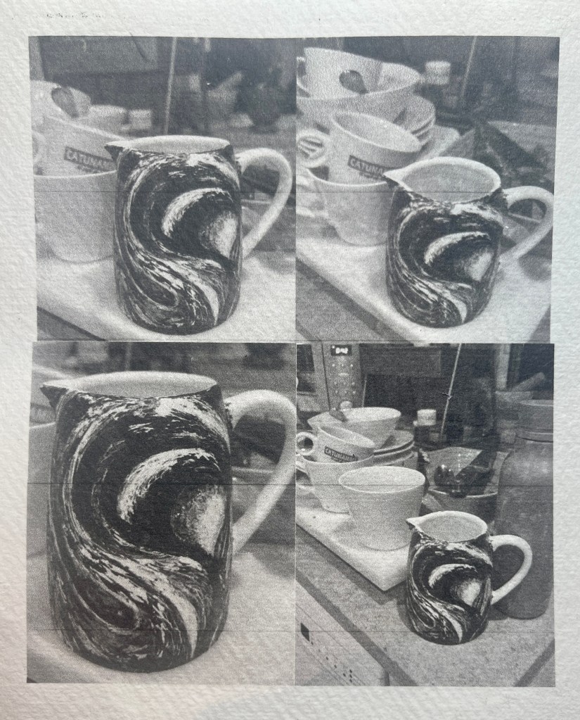 Wanting to place the image of Murmuration on to an every day object I painted a jug…It was an experimental process and a toe dip into this process. I used acrylic paint to recreate a sweeping 3D image surrounding its form…