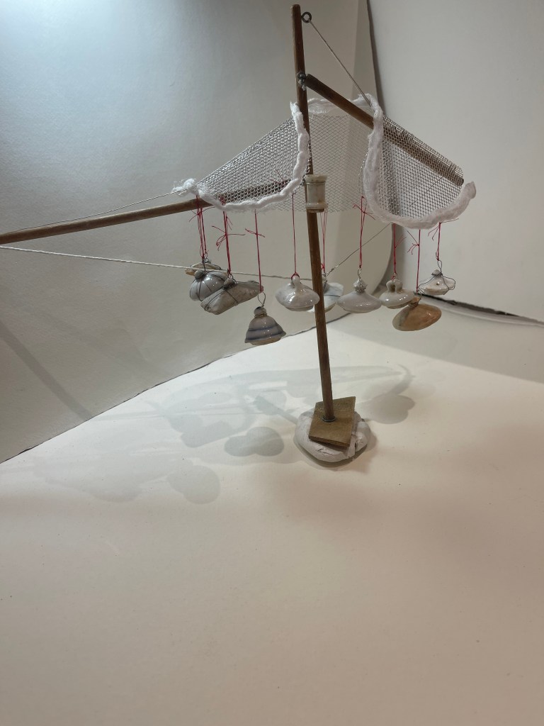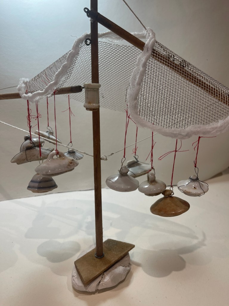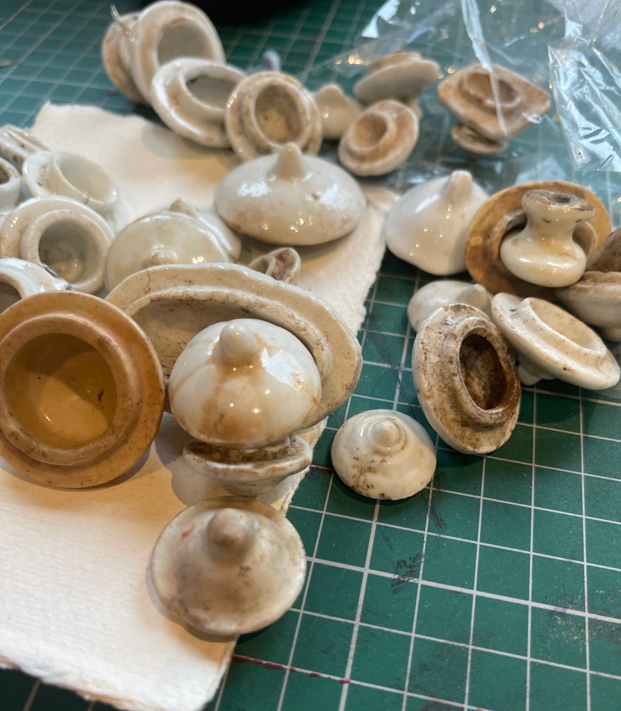 New exploration in this series involved using found objects: A collection I had purchased at a vintage fair of dolls house sized lids of serving and cooking pts. All found on the Thames mud banks… quite extra ordinary… I found their symbolism intriguing. There was no pots at all only lids in all shapes and sizes, a narrative I have not quite got to grips with but I felt it had to do with an emptiness, a loss, a sense of providing or unable to provide A domestic failure