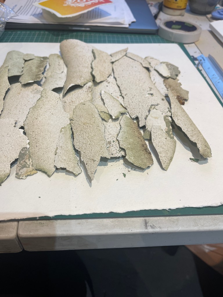 Arranging the pieces onto a canvas I was aware this was a vulnerable and unstable surface. They pieces were deeply curved and thick and at this point I decided not to try and permanently adhere them to the canvas.