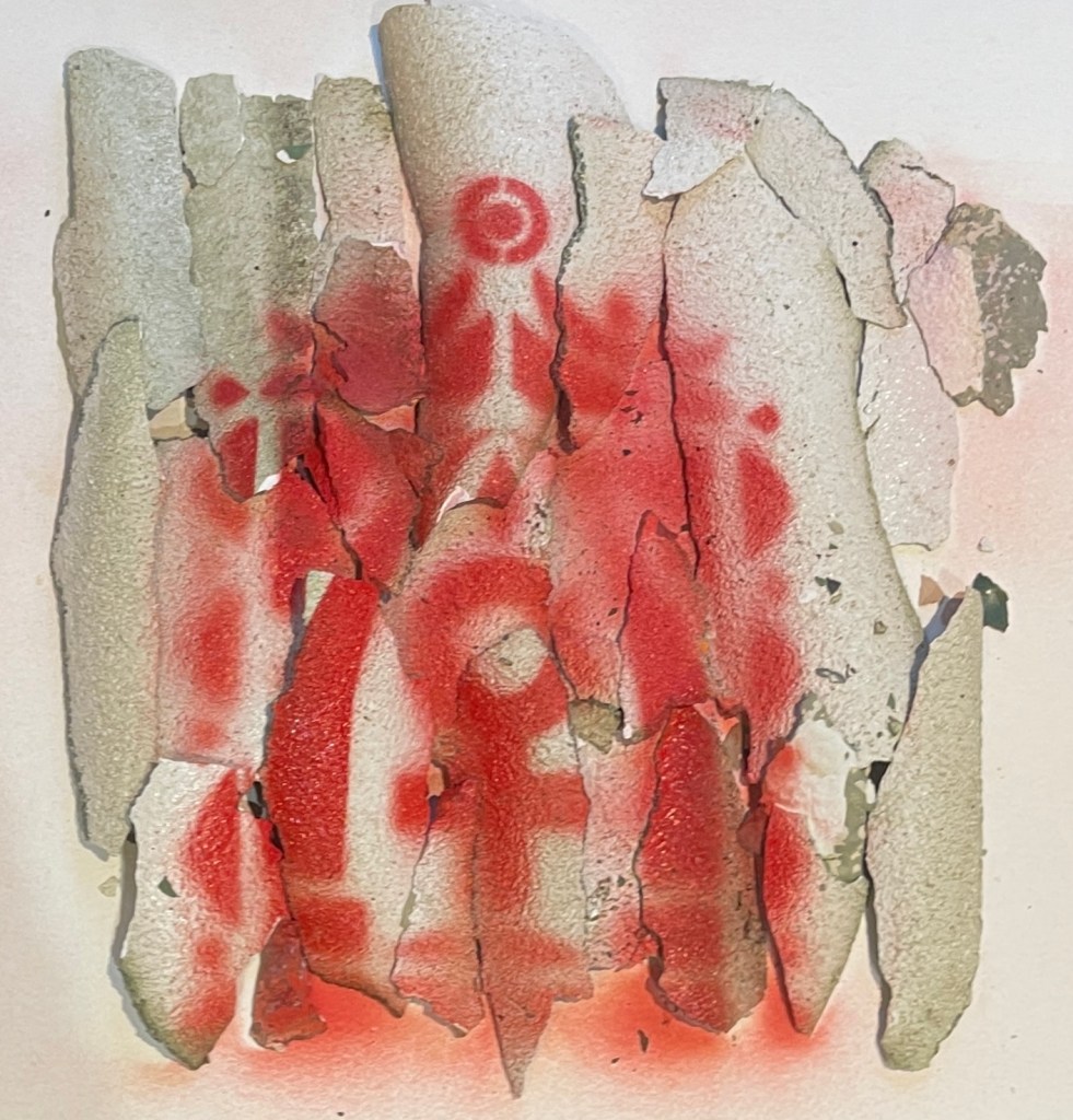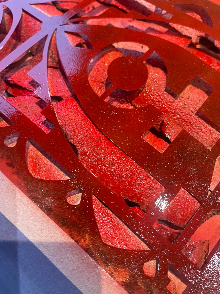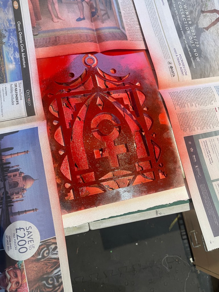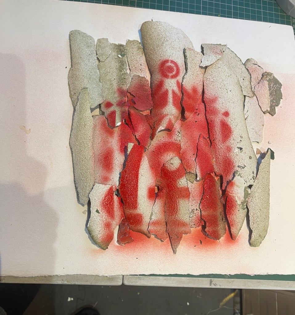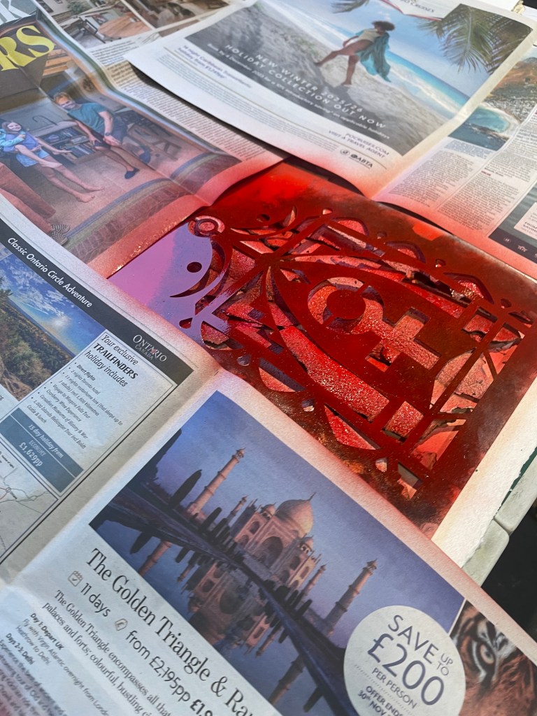 Placing the stencil over the top of the undulating surface I used a bold red spray paint to capture the image.