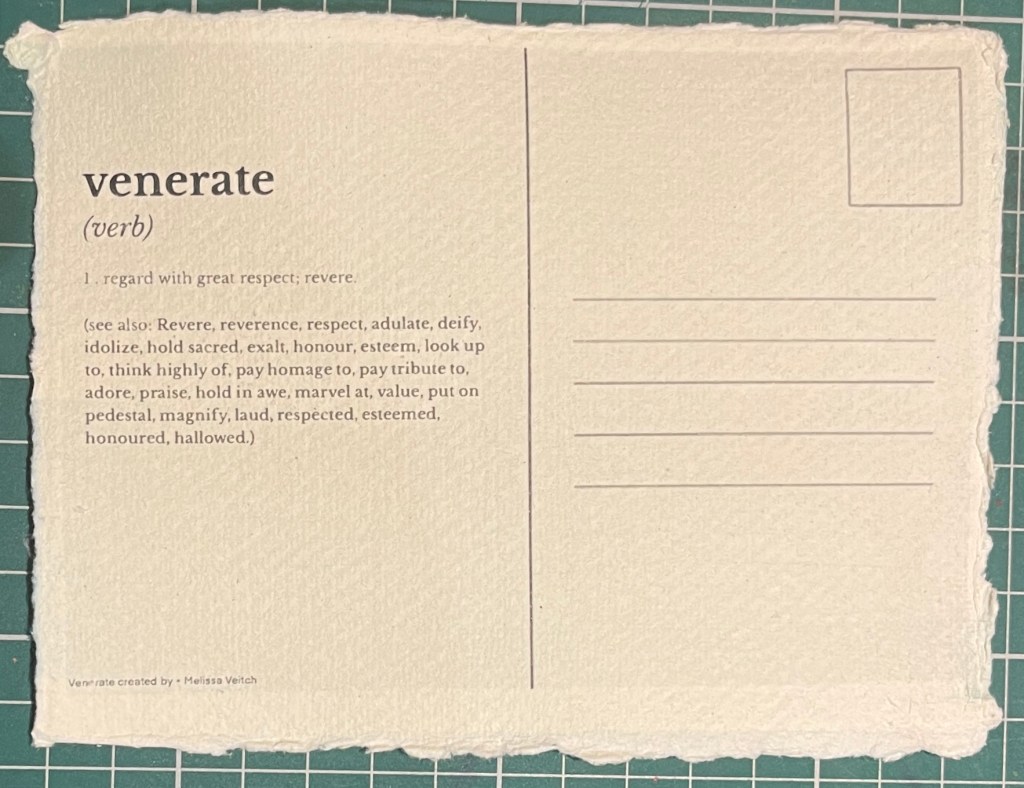 The post cards are set up as such and the back reads with the word ‘venerate’ – a potential postal collaboration with other women / artists….