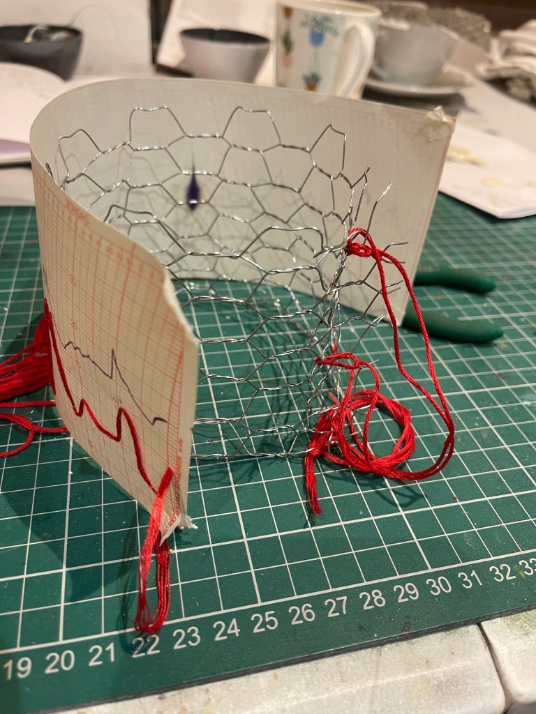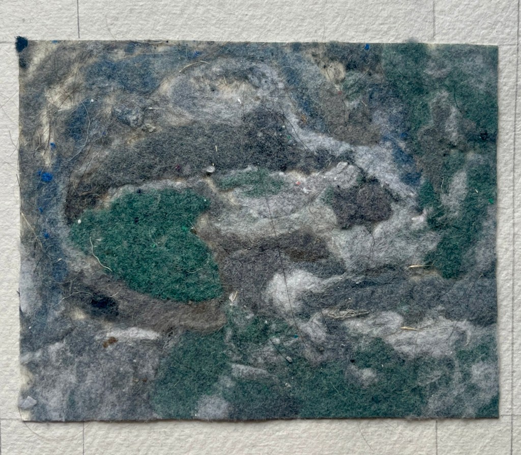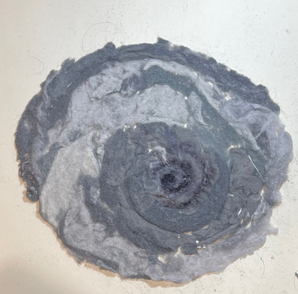 Using sculpting mesh I worked the felted matter into both sides of the fine wire. Rubbing and using a felting pin so the two sides would adhere to each other and bind between the mesh. This worked surprising well and meant th euse of glue was minimal to the adherence process.