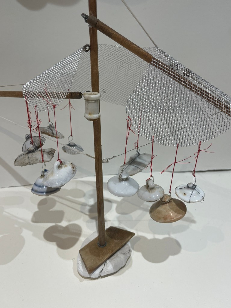 The larger sculpture enveloping the smaller ones is more intricate and enquiring. There is a strong sense of protection, and the hidden, and the restrained concerning it. I believe it is this theme that strongly resonates with the narrative of the traditional male and female roles of ‘home maker’ and The ‘hunter gatherer and protector’. It also speaks of the internal working of machine and the domestic, the hidden body of toil and work associated with the domestic.