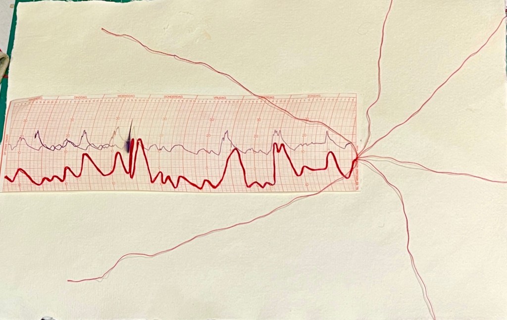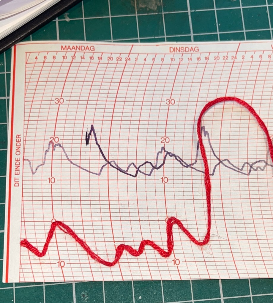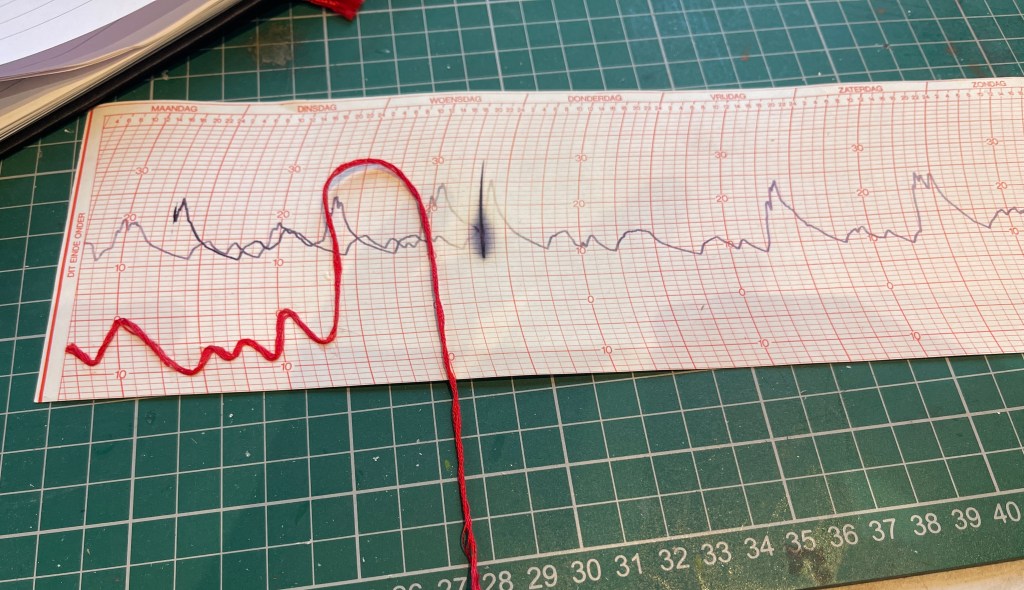 To give them a greater sene of visual presence and drama I copied the lines made by the barographs arm in red silk thread below the inked line .