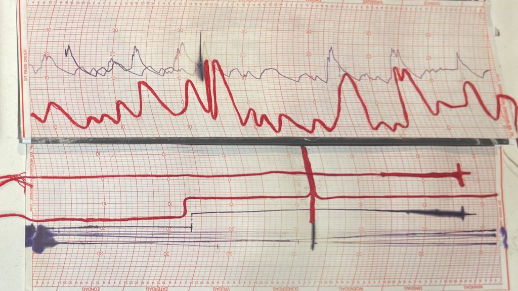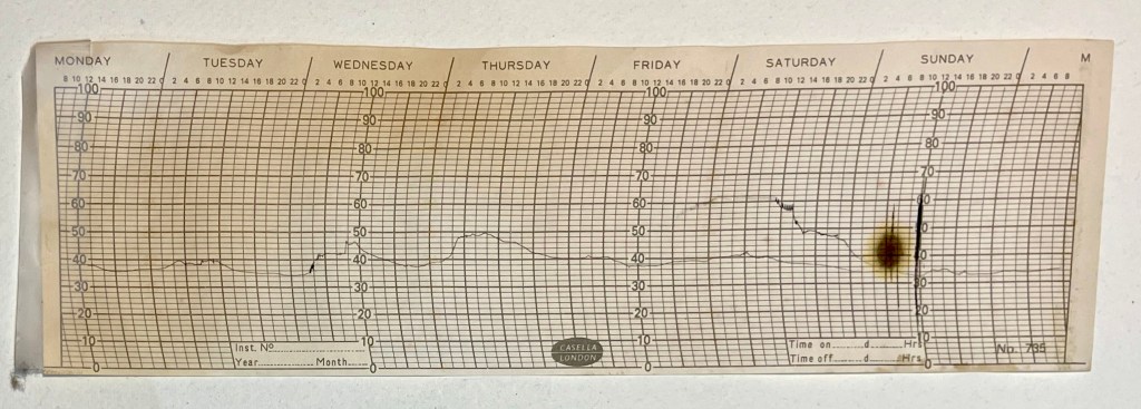 Exploring the the old sheets from the drums of the barograph I found them reminiscent of a medical examination, a brain scan or lie detector test. They were delicate and exact, wavering and moving across the time time. There were peaks and troughs, ‘ a good day and a bad day’ as the barograph recorded the undulating air pressure.