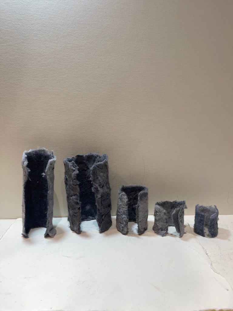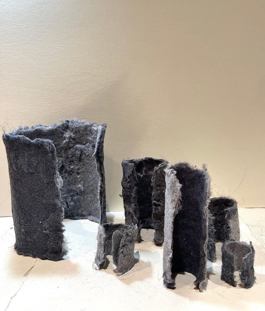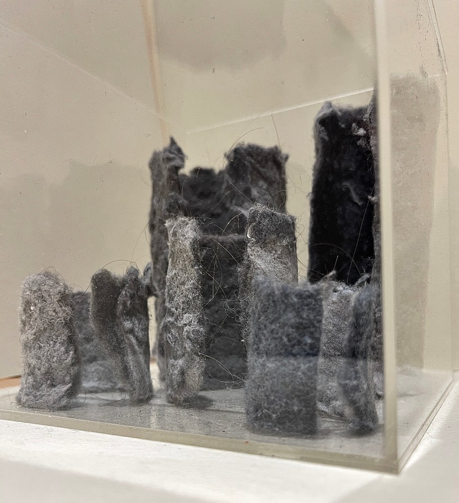 The works evoke a sense of family and human form with out it actually being there, non binary and unspecific we are inherently drawn to see a group of object as relation able to each other, not individual as such. What is interesting about my chosen material of detritus /fluff from a domestic washing machine is that is brings together all various waste matter and remnants from a range of garments and individuals into one reconstituted mass.