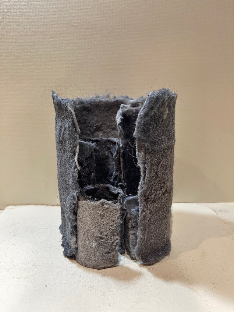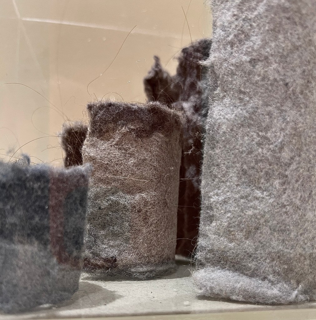 This process was repeated a number of times changing colours and size. The shaping of the forms was manipulated by hand rolling and pressing them into each shape. The variety in size of the pelts did dictate some of the forms, with the large piece being a patchwork of the dark felt colours.