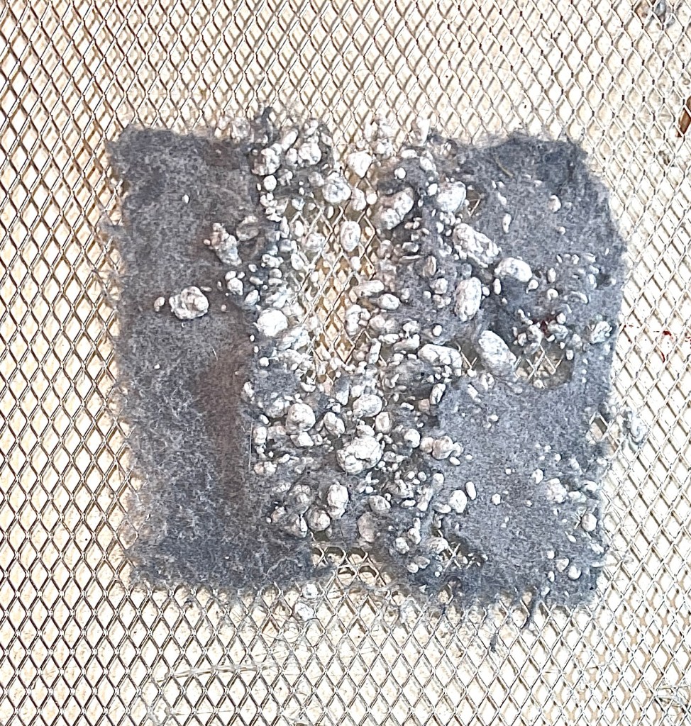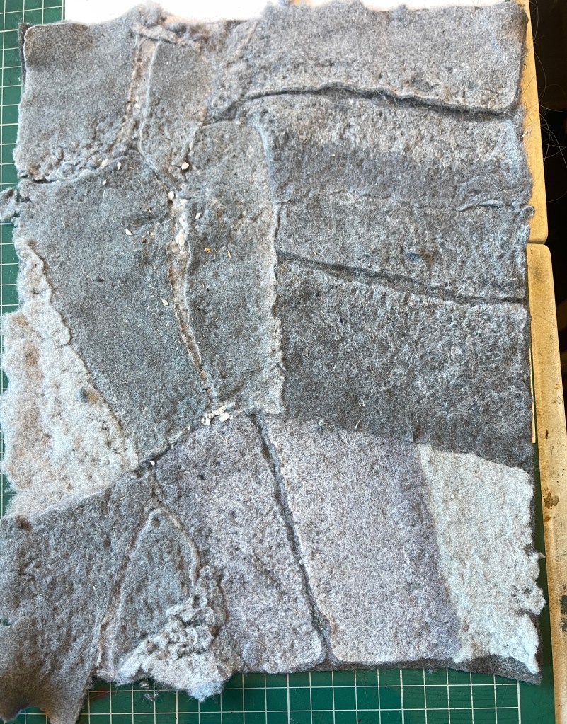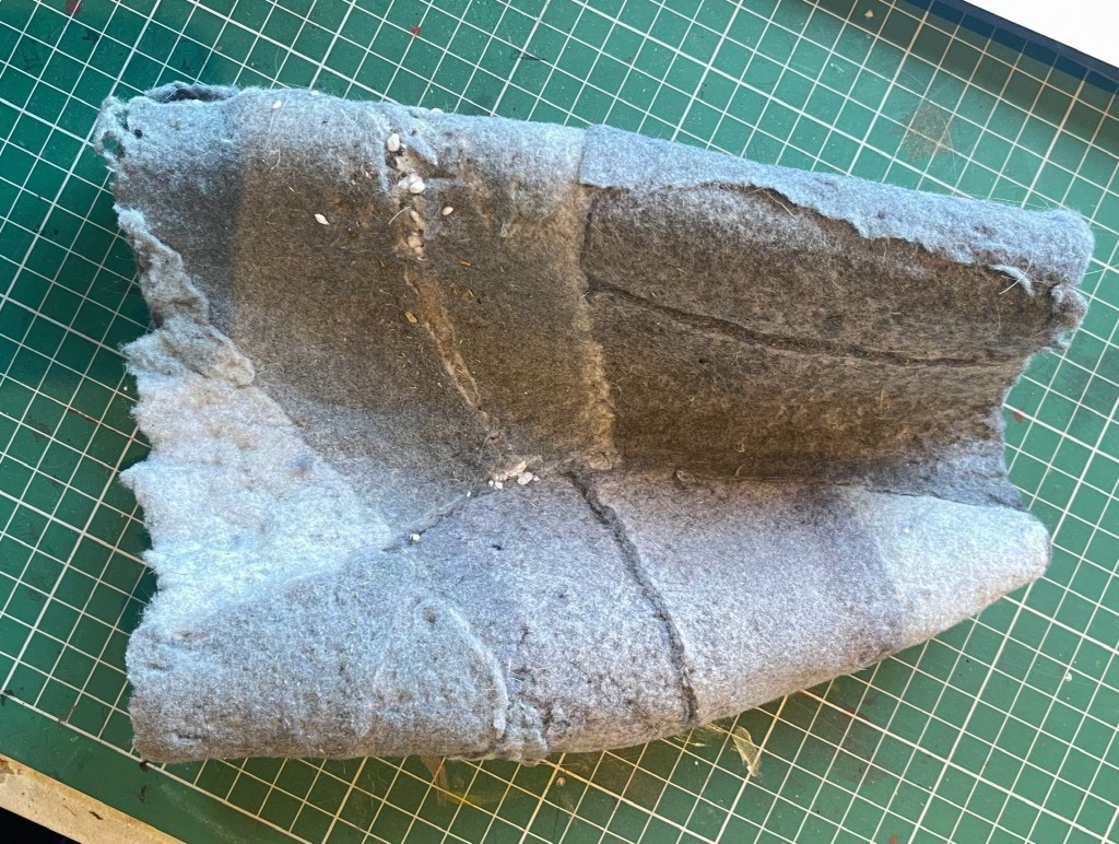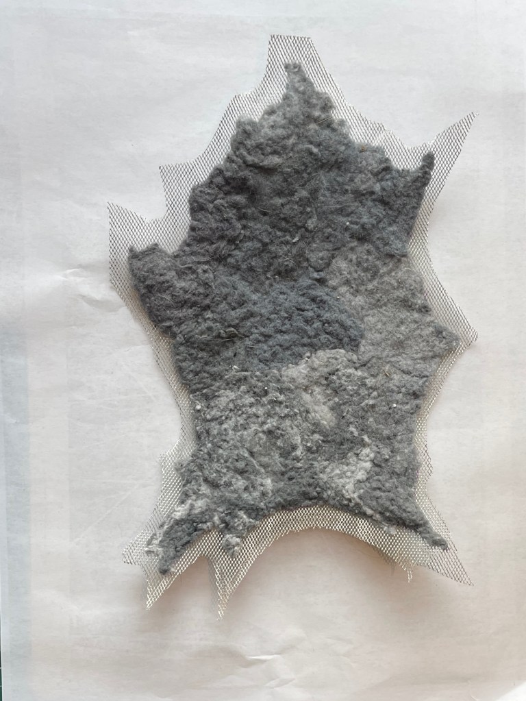 Going forward I need to find a way to securely attach them to each other.. possibly by using thread to connect them. The felting has stiffened the fabric but this has also increased its malleability and durability. I will also explore using a bigger tray and see if I can expand on the individual size of the ‘pelt’.