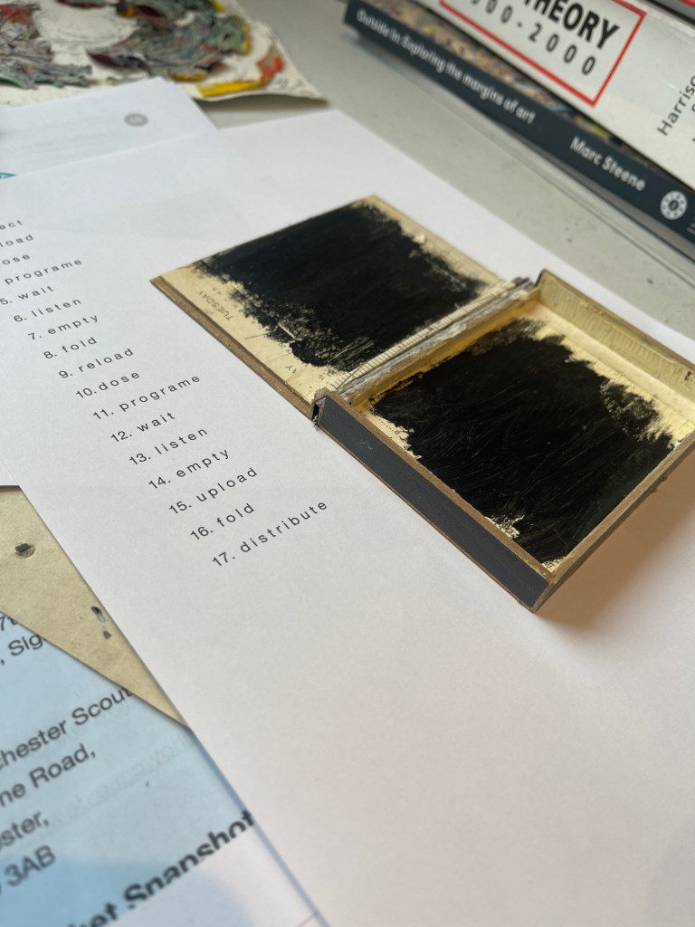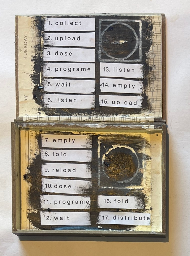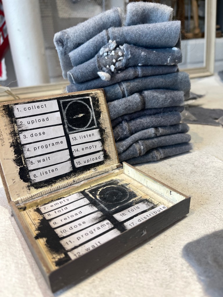 The image below shows the shallow boxed text alongside a stack the folded felt material. The nature of the found felted detritus – neatly folded and stacked has a resonance with the trope of the washing itself . The range of actions and processes documented in text like an instruction manual with a robotic feel and tone. Devoid of emotion and sensitivity endlessly on repeat….
