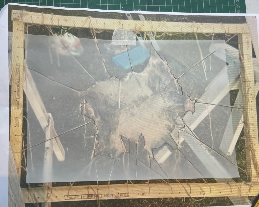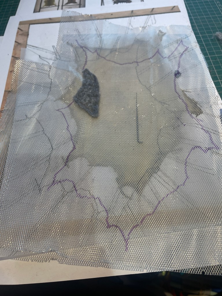 Using a single pin to begin a process of pin-felting. Copying out a shape similar to an animal hide onto tracing paper and copying this shape onto some fine sculptural mesh.