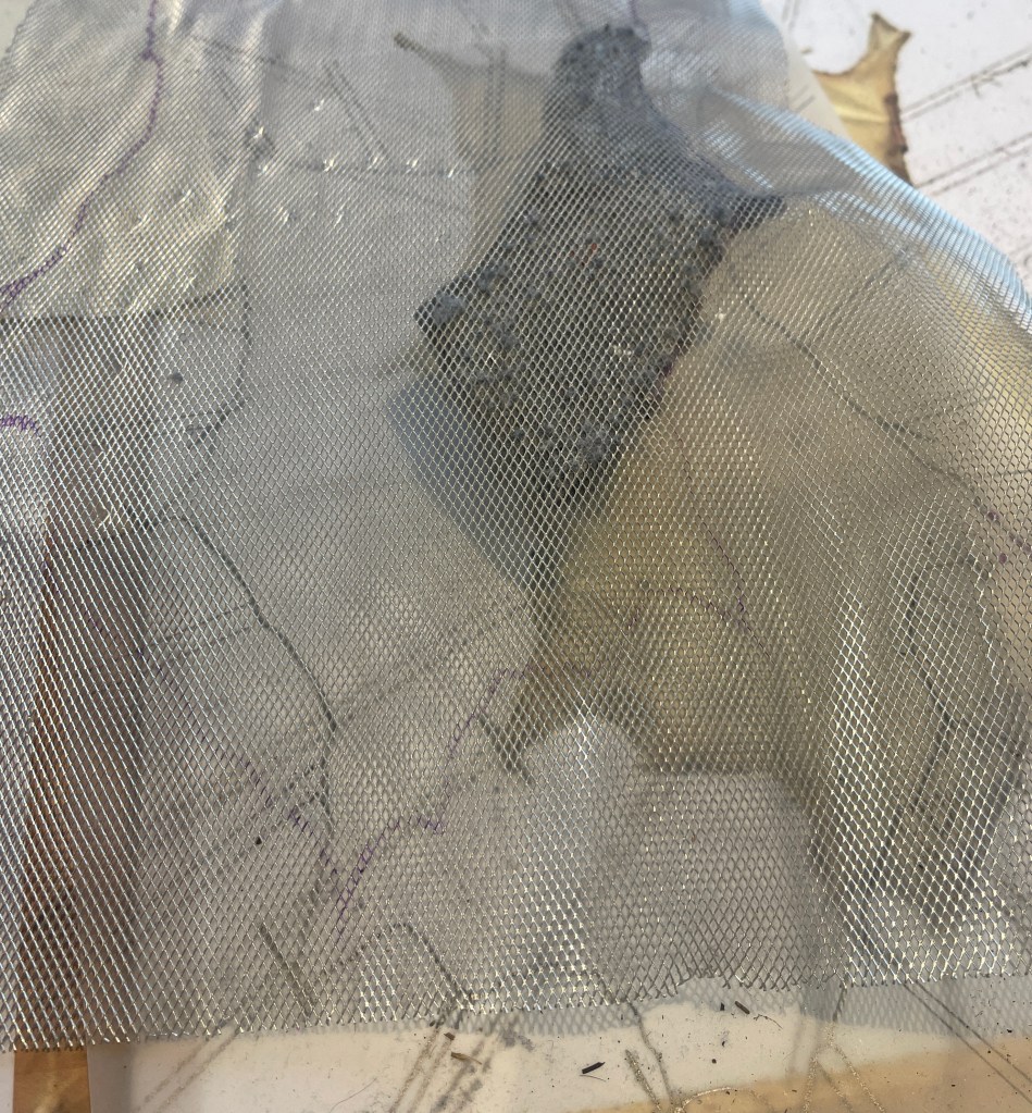 Laying out the felt pieces in the tray. In a cross hatch fashion. Adding a net/mesh over the top.