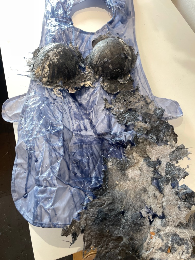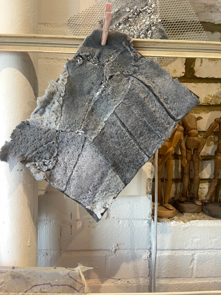 In order to physically expand the material I began to process of felting to bind and connect the separate pieces to create a larger scale work. I saw this as being a way to explore a large body of material and it potential to create a ‘ shroud’ or cover.. ‘an invisibility’ cloak the grey detritus the unseen and forgotten domestic labour, housewife, care giver, homemaker wears every day.