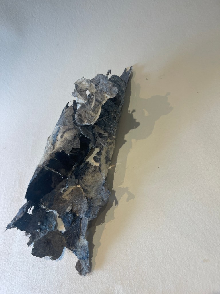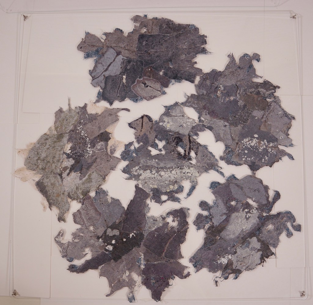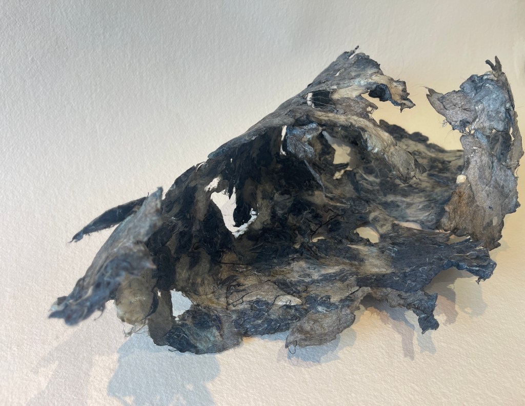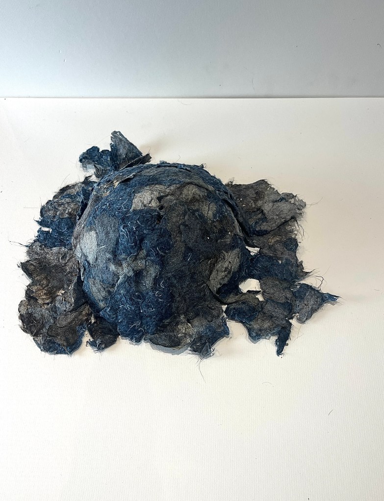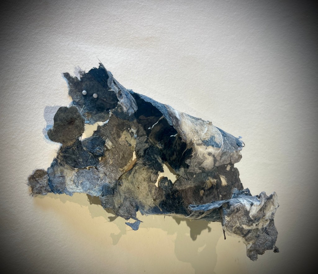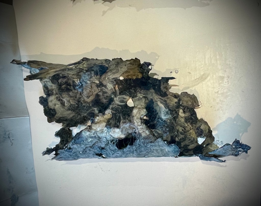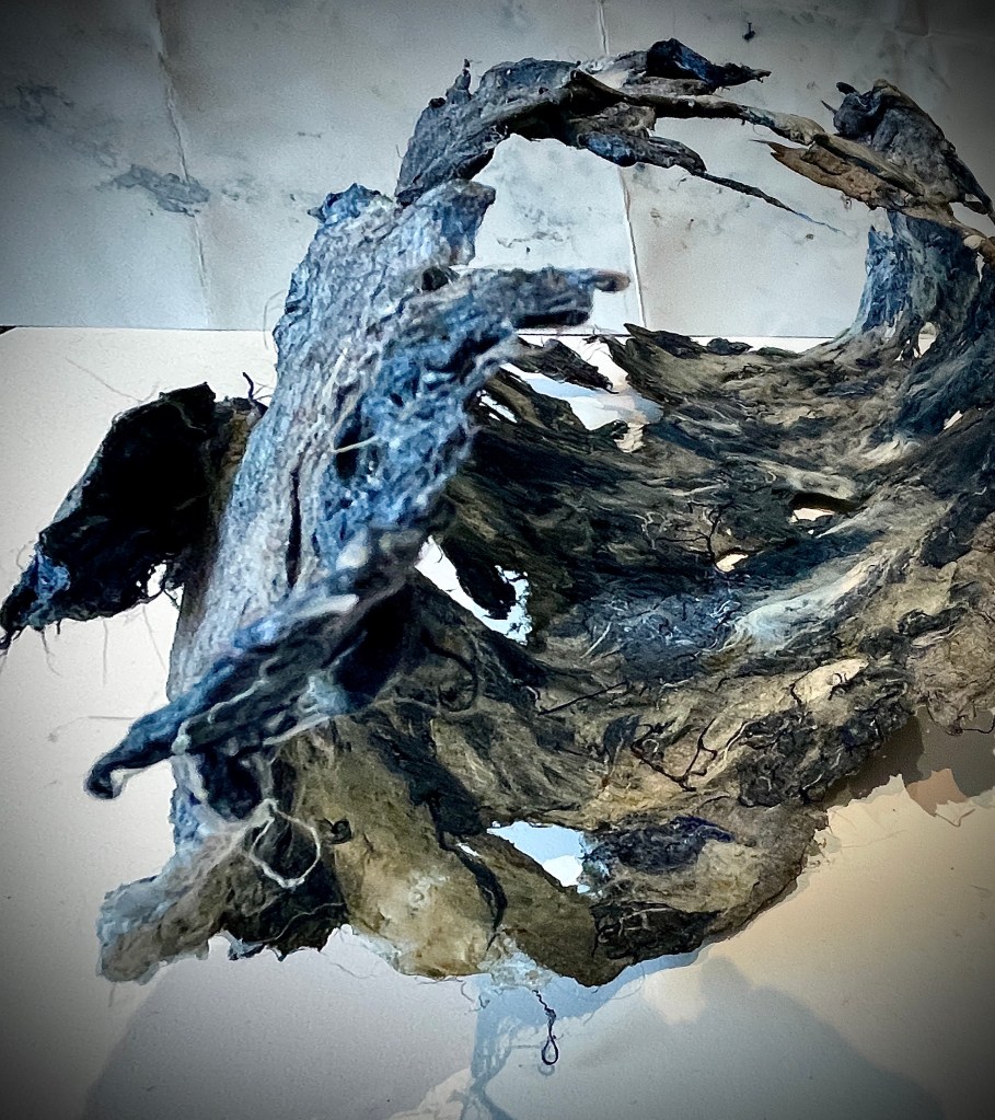 For me this was much more the metamorphose I was hoping for in regards to playing with this material. Bringing out its fragility but also its surprising toughness now. The shapes of the felted pieces still visible, as is the colour variations . Excited that the large ‘washed’ balls of tissue have remained, squashed but present in the ‘pelt like’ form created. There is good narrative in the varied patten shape and texture, a range of colours and mini- histories created from each section.
