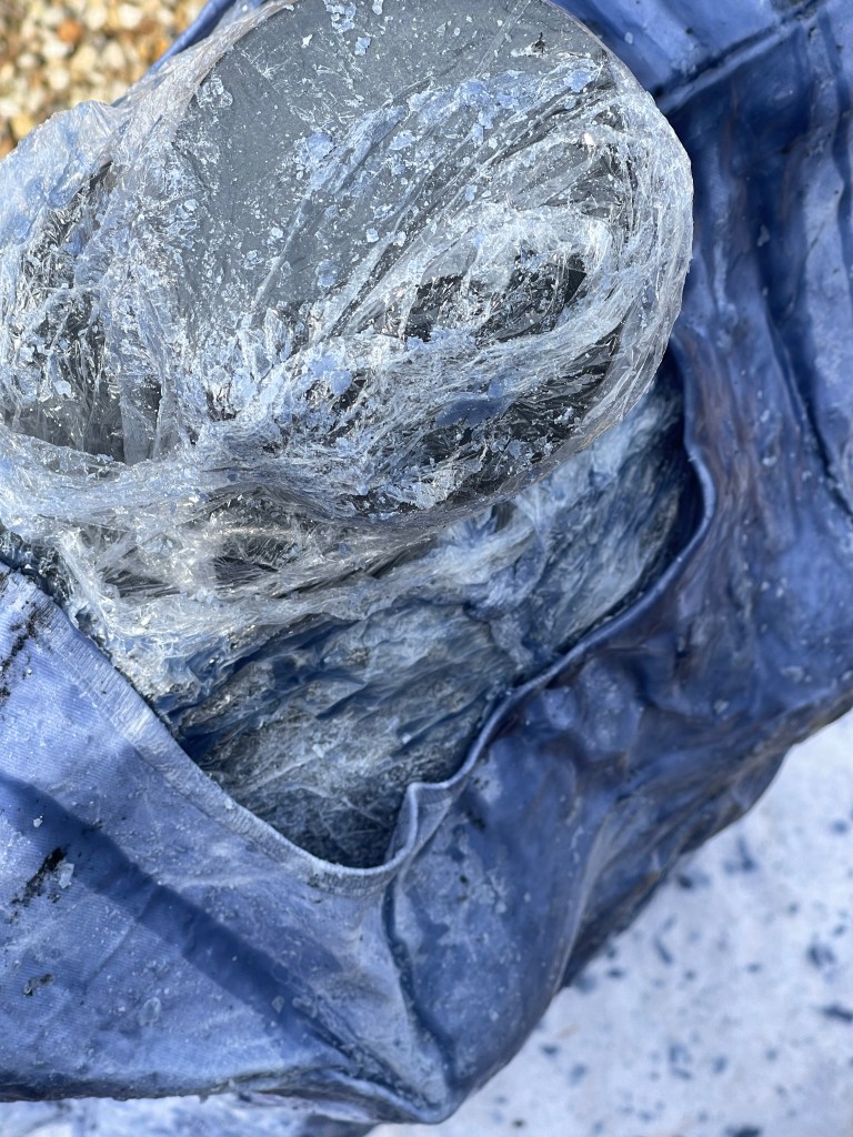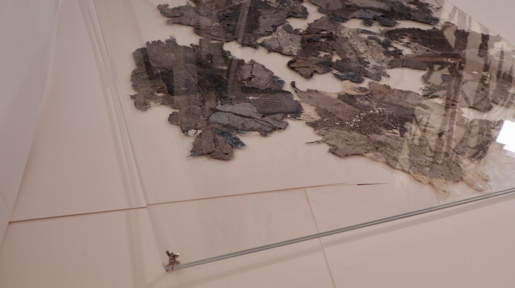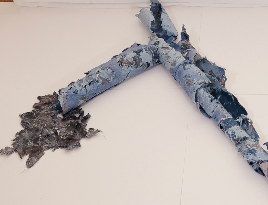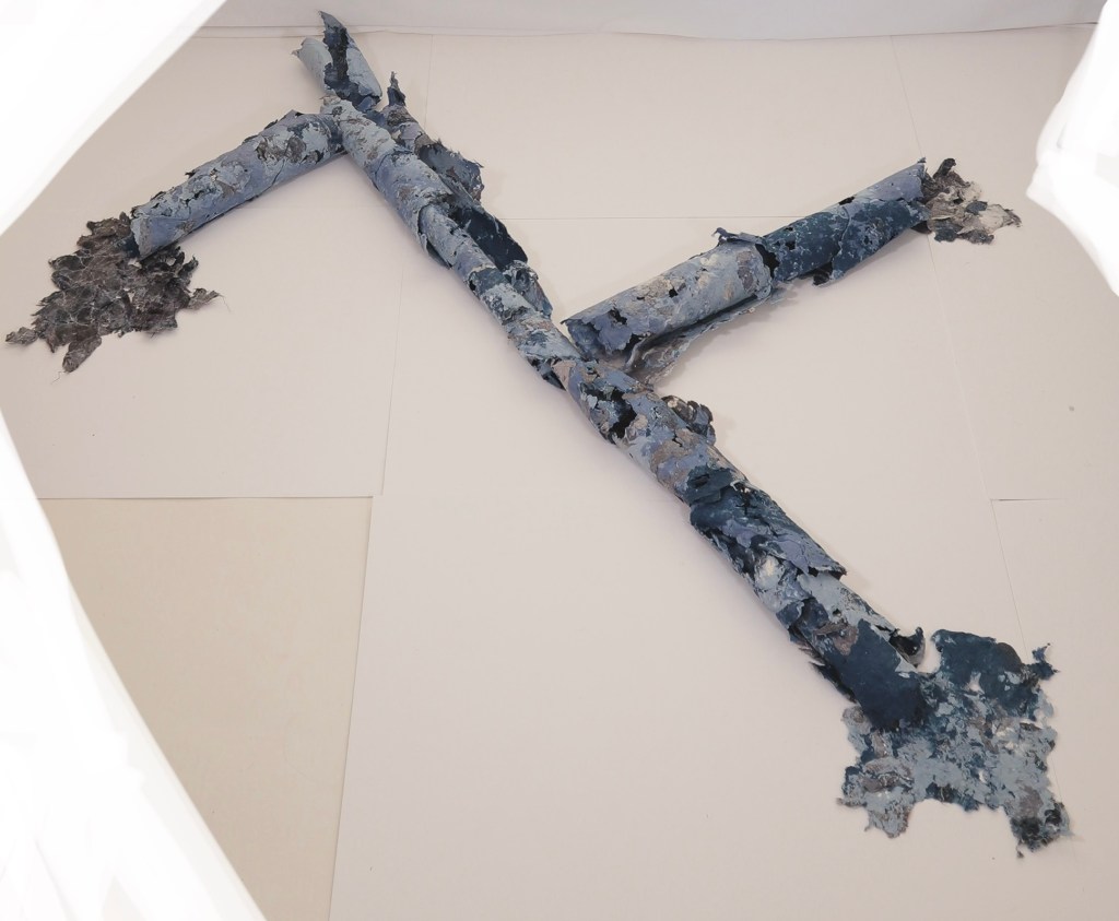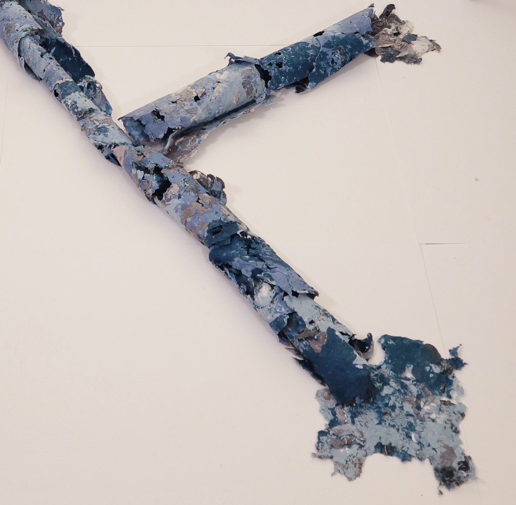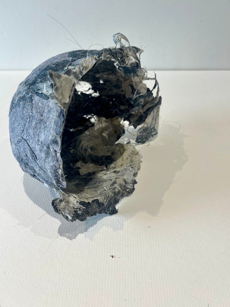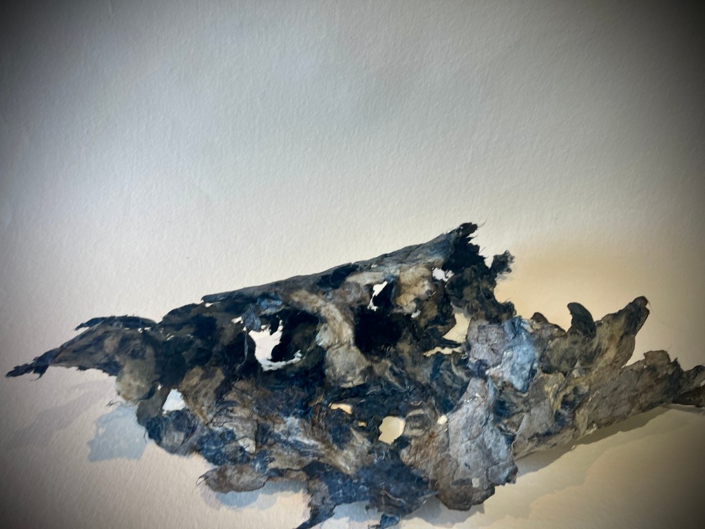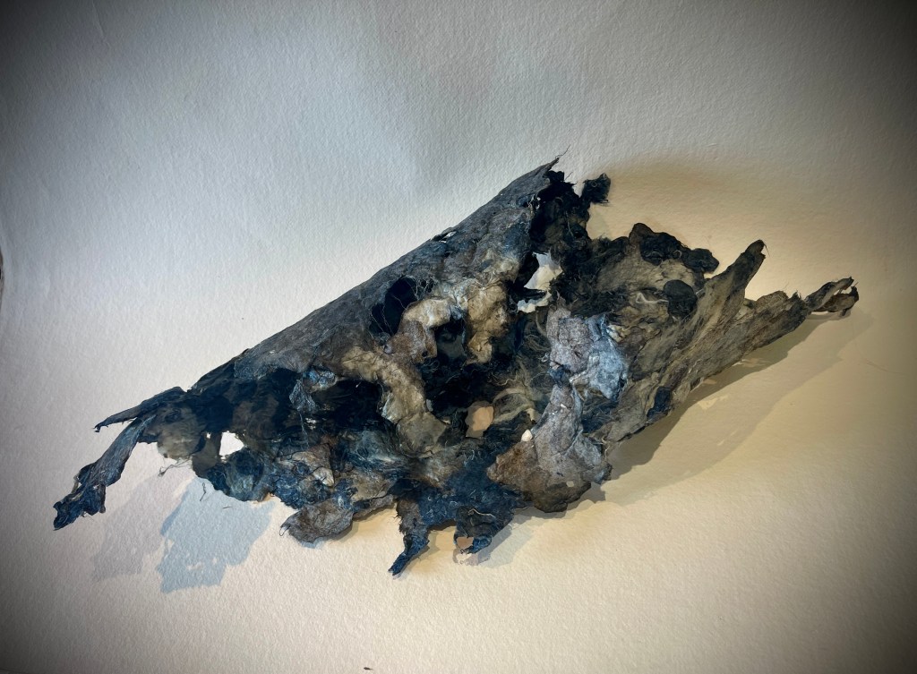For me this was much more the metamorphose I was hoping for in regards to playing with this material. Bringing out its fragility but also its surprising toughness now. The shapes of the felted pieces still visible, as is the colour variations . Excited that the large ‘washed’ balls of tissue have remained, squashed but present in the ‘pelt like’ form created. There is good narrative in the varied patten shape and texture, a range of colours and mini- histories created from each section.