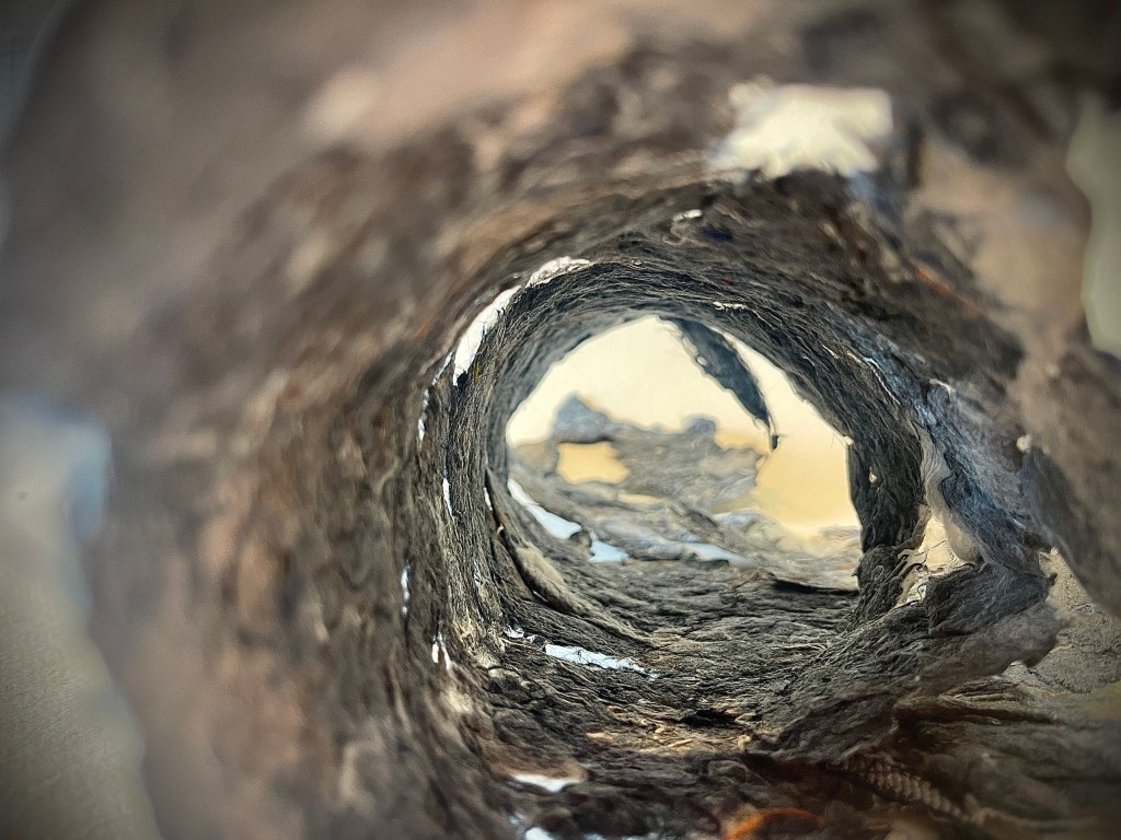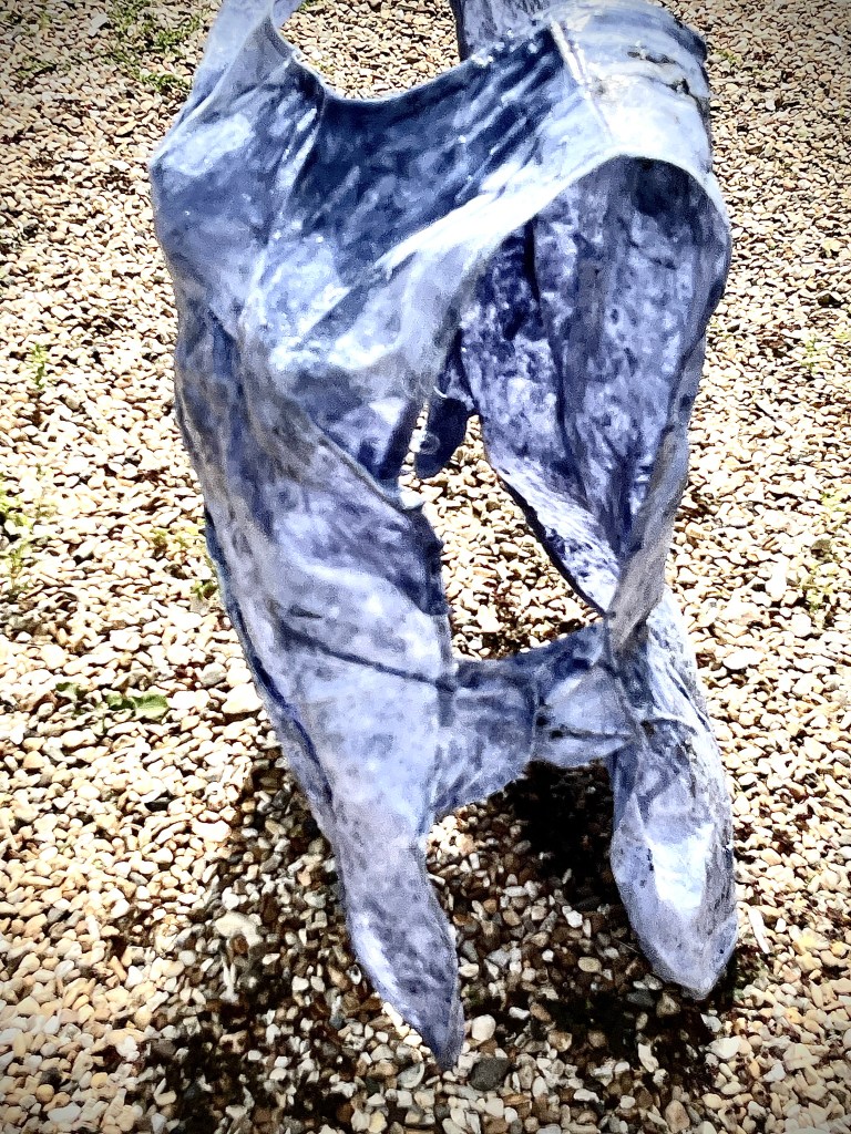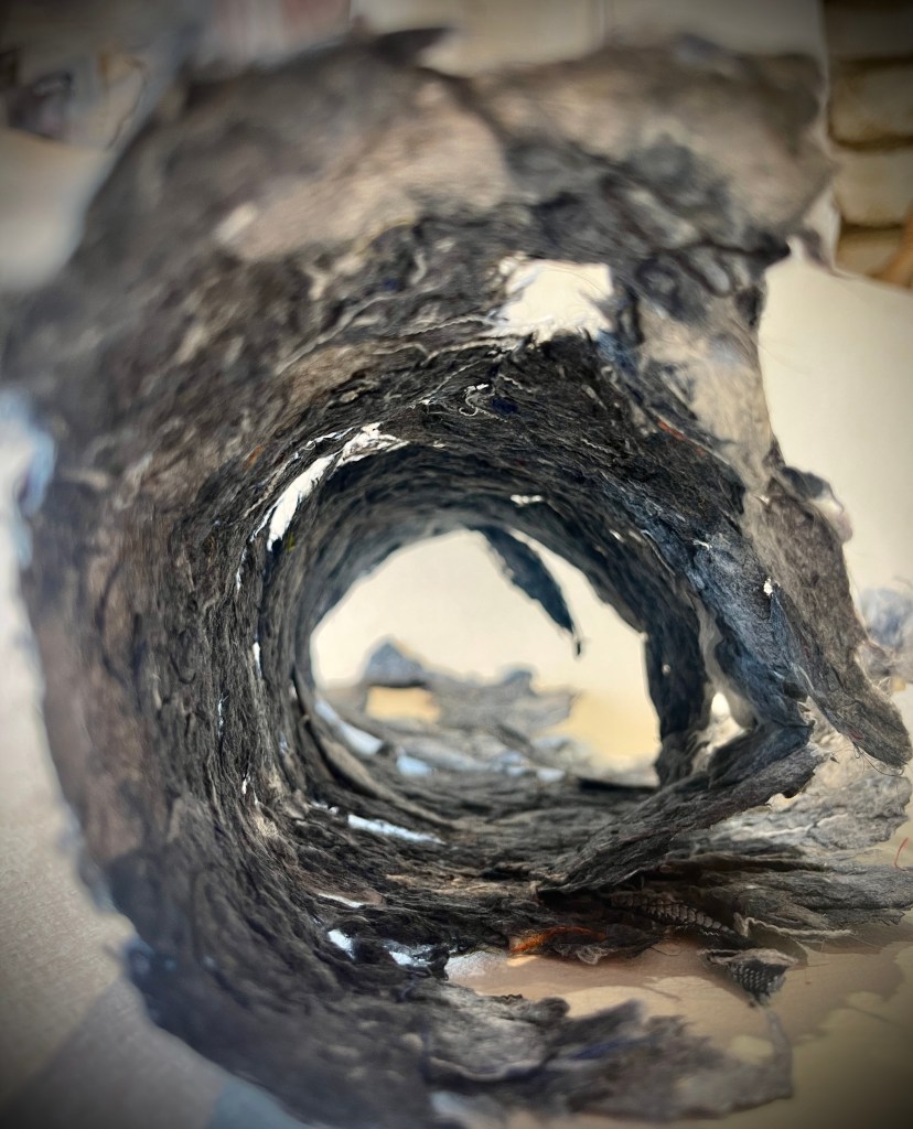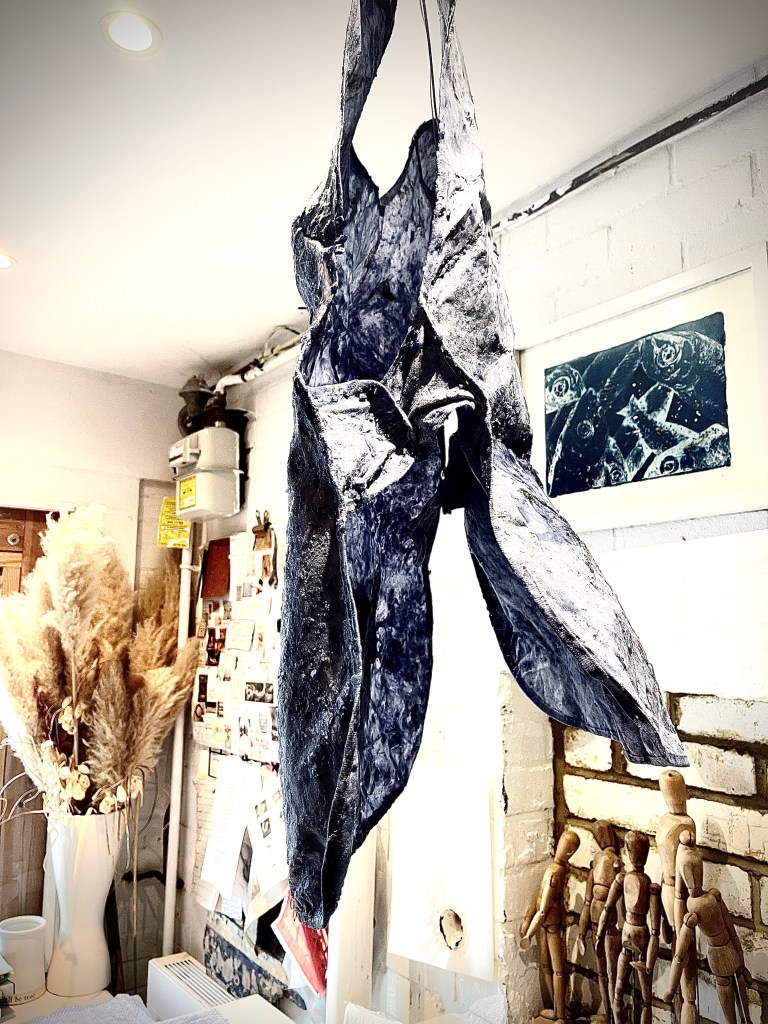 Once hung up it became something else, a statement of power, resilience, strength a statuesque hanging with prominence to be taken notice of, not hidden away or unobserved . It is a strange and almost unrecognisable form distorting the visual narrative and opening up a deeper level of enquiry . Is there something uncomfortable about an open mouth imagery – as if its about to speak or shout out ?