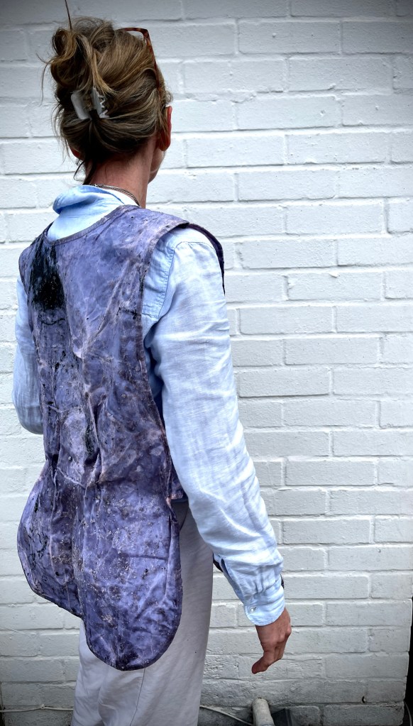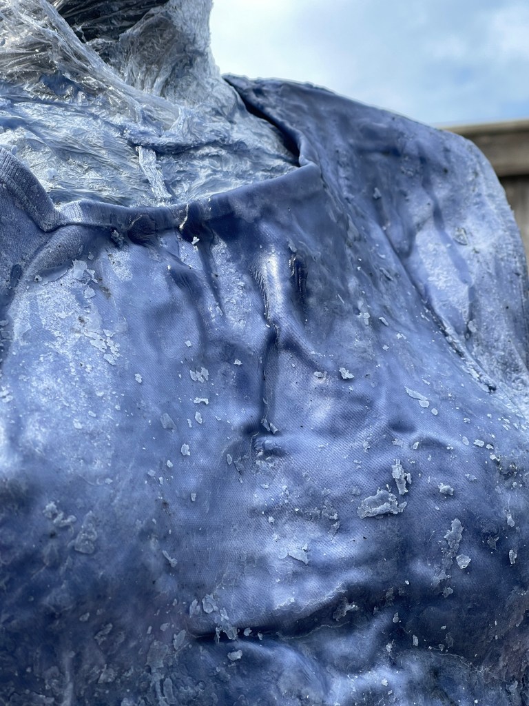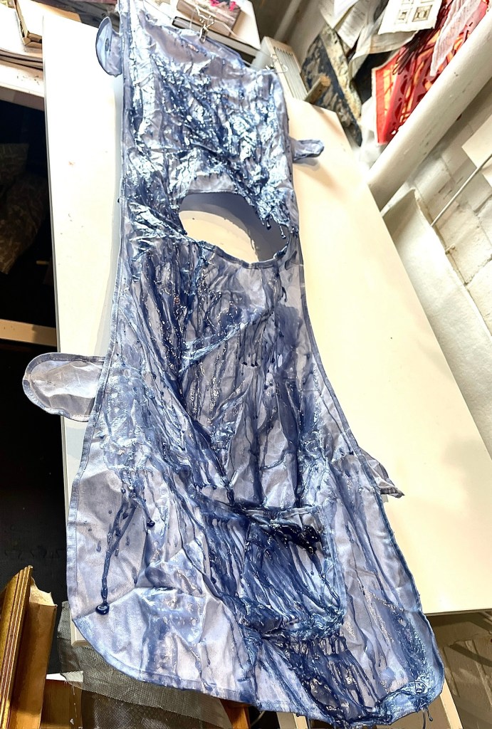 I hung the wax tabard up and poured further wax over and down it to create greater visibility of the wax solidifying the material and the intriguing twists and turns th ewas run too as it made its way down the full length of the garment – finally dripping of the end.