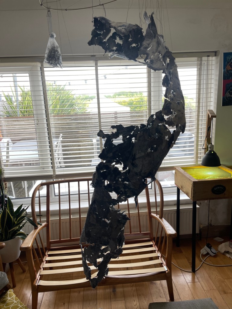 Continued to explore the personal practice elements of my work with the Murmuration theme concerning female mental health. My large sculptural work was now floor to ceiling and made solely from felted machine detritus. Its disturbing and uncomfortable form, materiality and presence evoked a reaction to friends and family that viewed it. A need to touch and enquire into it, to stand around and beneath it. It proved to be very much at odds within a domestic setting.
