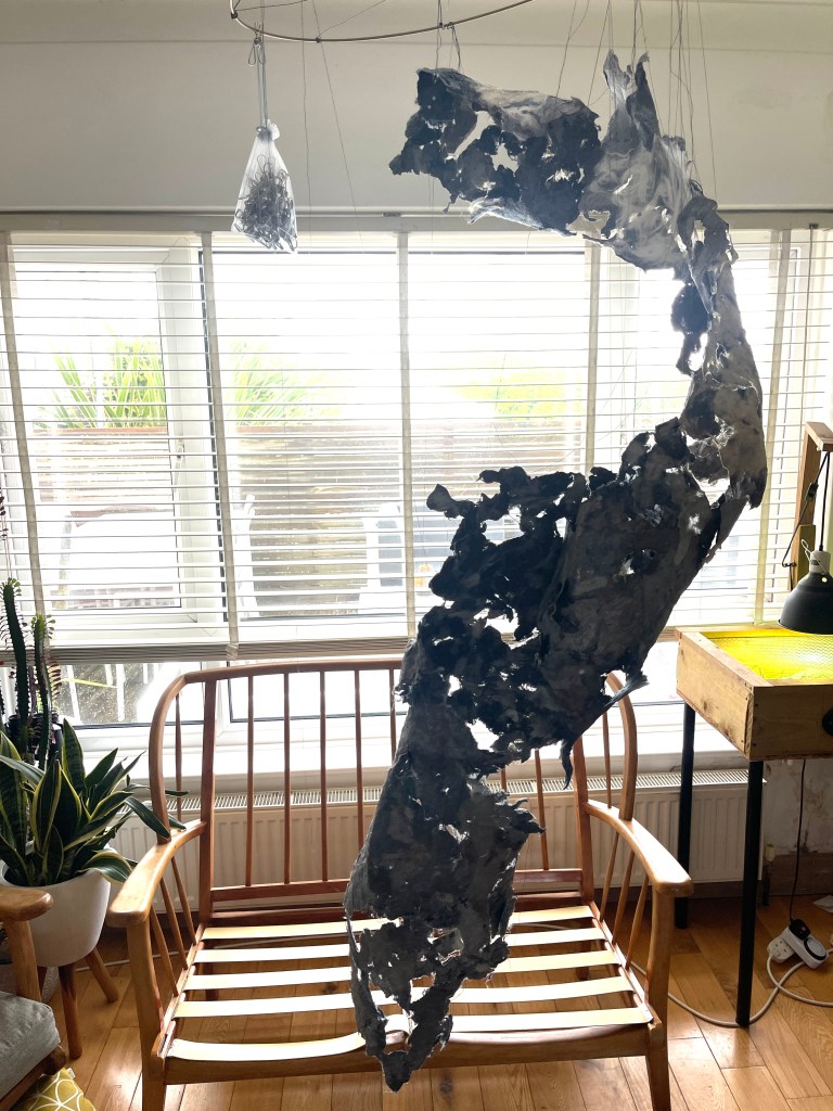 There was a solidity and heaviness to this outcome that I was not comfortable with. While malleable and flexible and with the potential to become much bigger it lacked the material delicacy inherent in the material which was important aspect in exploring the narrative of the work. Although I wanted to reinforce the material in order to be more adaptable this did not feel like the right line of enquiry. I was looking for the material to support its own integrity and not be reliant on a pre – made backing.