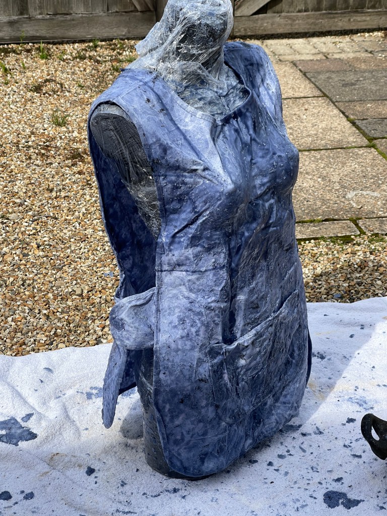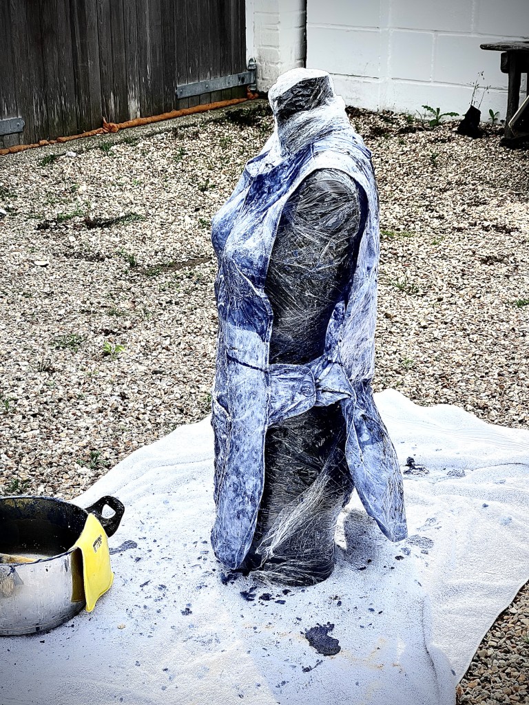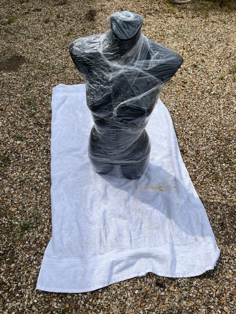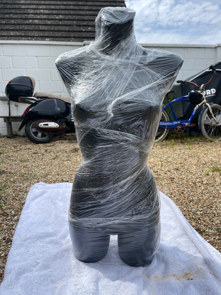 Covering a mannequin in clingfilm to protect it before applying the apron and wax solution.