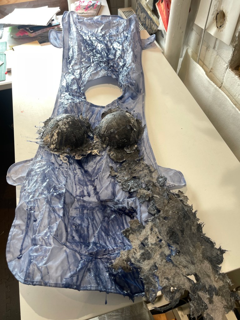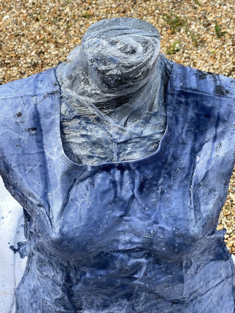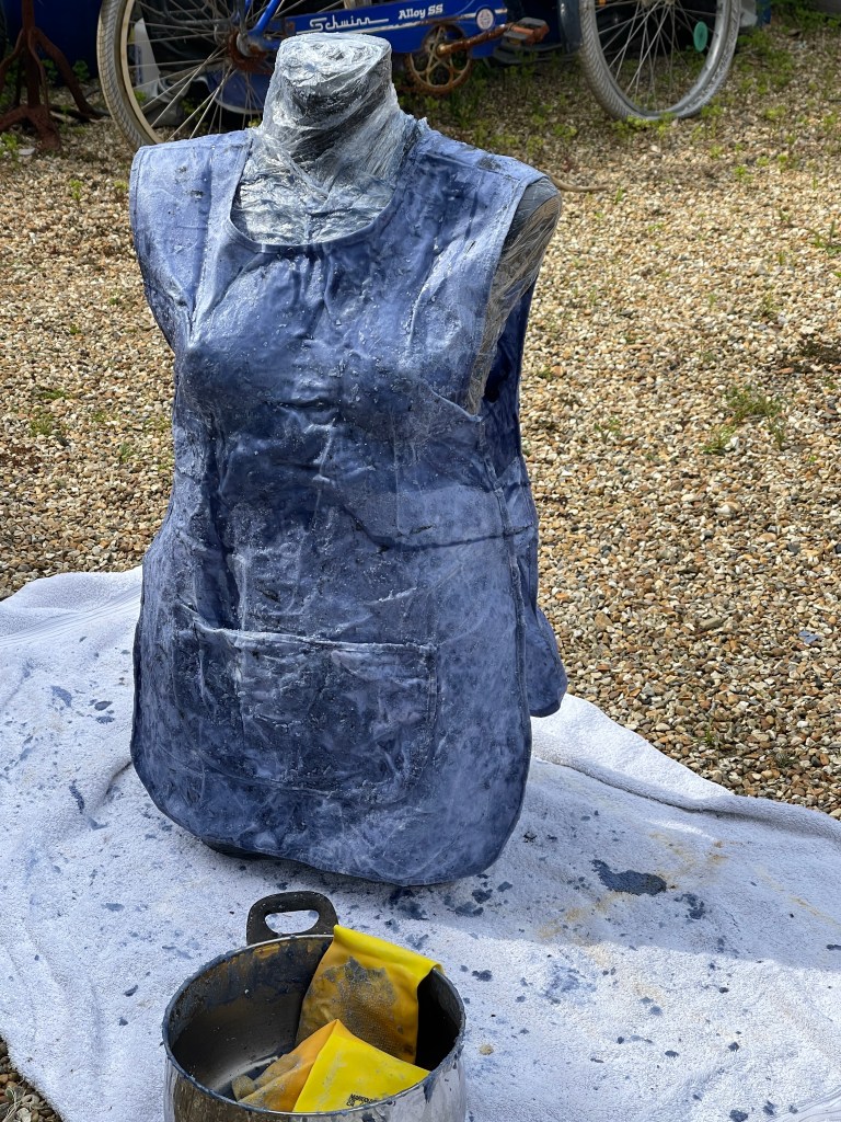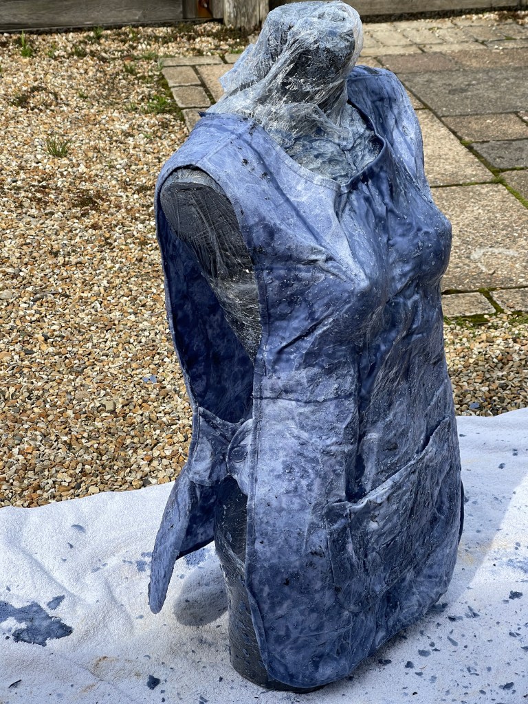Adding the pre-soaked apron to the mannequin and pouring the hot wax over it. Using rubber gloves I then pressed and moulded the apron into the body shape to create a sculptural effect.