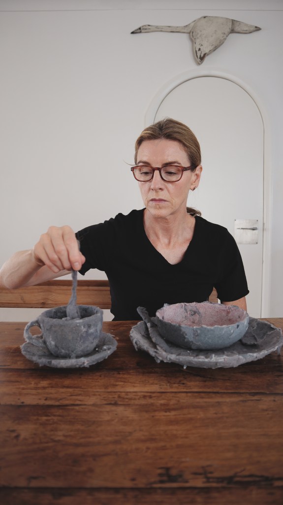This exploration was initially explored with a single cup/saucer format and did evoke much interest at a recent exhibition space. The uncomfortable and yet the familiar and the seemingly soft, fluffy form of. the cup encouraged much viewer engagement and enquiry. The explanation I offered was in regards to it being a metaphor for our daily lives. The daily ‘cuppa’ so synonymous in society and in a family, domestic role as well as outside of it in an office or other commercial environment. It is symbolic with imbedded cultural and societal references of comfort, relationship, hospitality, greeting and sharing. It is such familiar an object of our every day as is its making ritual.