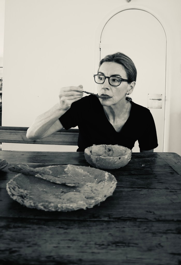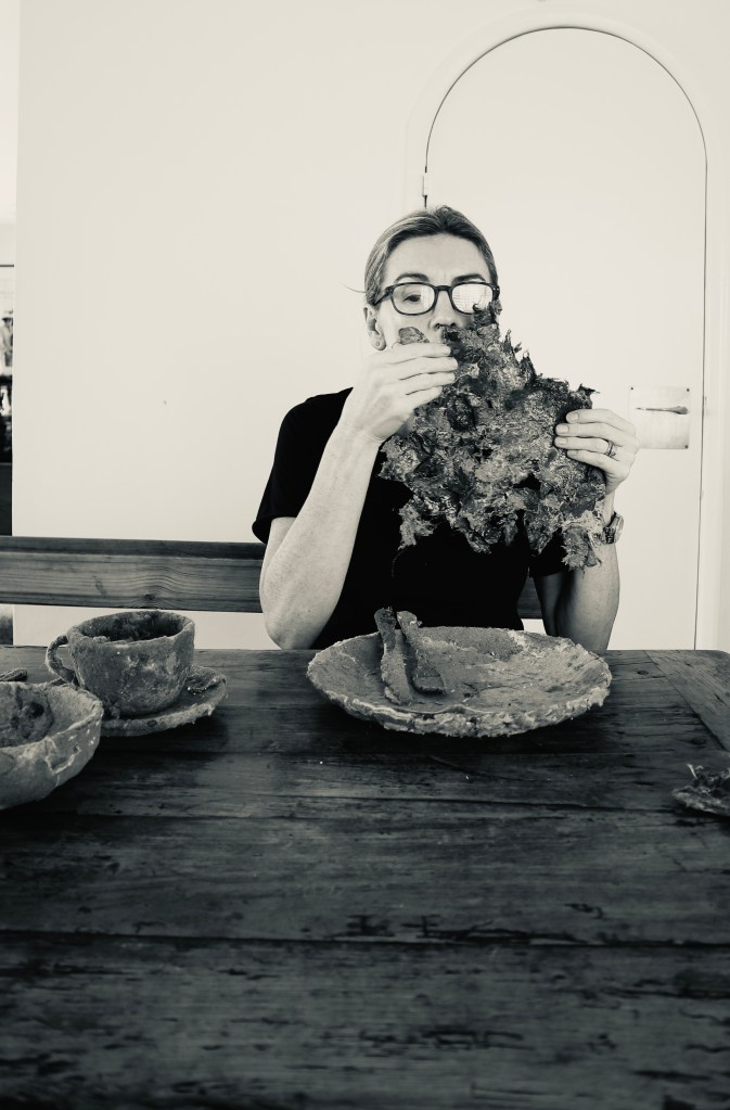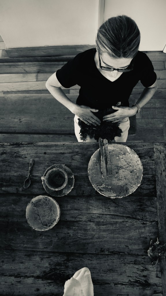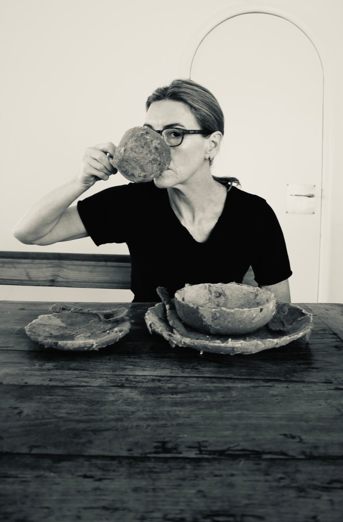 The relevance of own practice and narrative behind these objects can be explored with elements of a performative practice. They amplify with a sense of scale and relatability when seen in the domestic setting. With this in mind I arranged for some photographs to be taken with the items at my kitchen table simulating the process of eating and drinking from them.