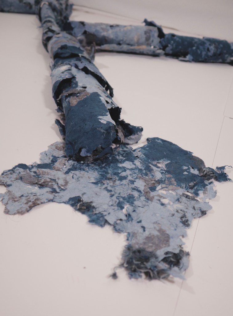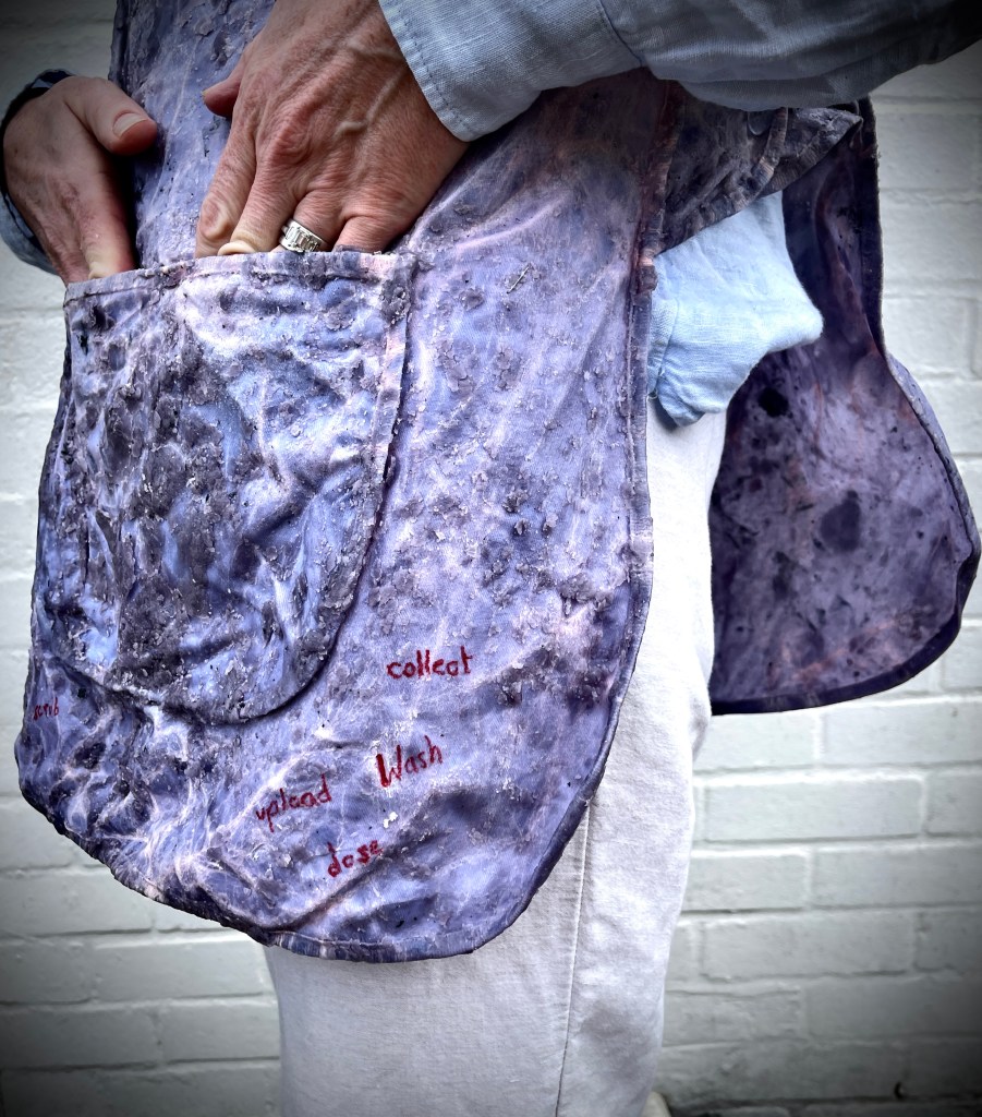 My thoughts on presenting it in a white space environment allowed the work clarity and focus. The domestic setting whilst pertinent did not allow a full unhindered visual exposure. Further influenced by Marina Abramovic and her visceral performances (viewed at the Royal Academy 2023 ) I was aware of the power the artist had to to play a part in their work. I decided to explore this visual inclusion here adding to the narrative of the work but also further underscored my personal practice and concerns.
