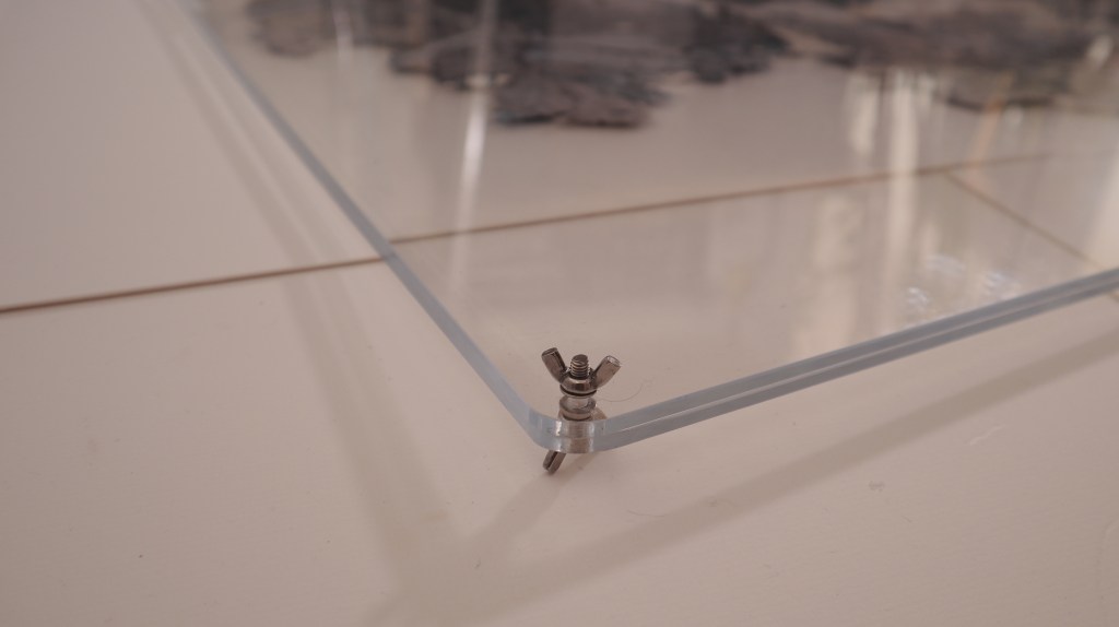 A final curation for the initial felted work from machine detritus was placed into a Perspex double sided frame attached with wing nuts, reminiscent of machinery This flower like arrangement was intriguing as it bellied the materials place of origin. On closer inspection one can see the flower like arrangement is far from ‘pretty’ and is in fact machine detritus.