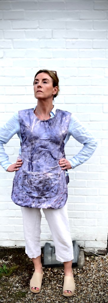 I purchased the modern equivalent of the traditional apron, a tabard. A white utility item for women. A simple shape with a large pocket in the front. Button fastened at the sides.