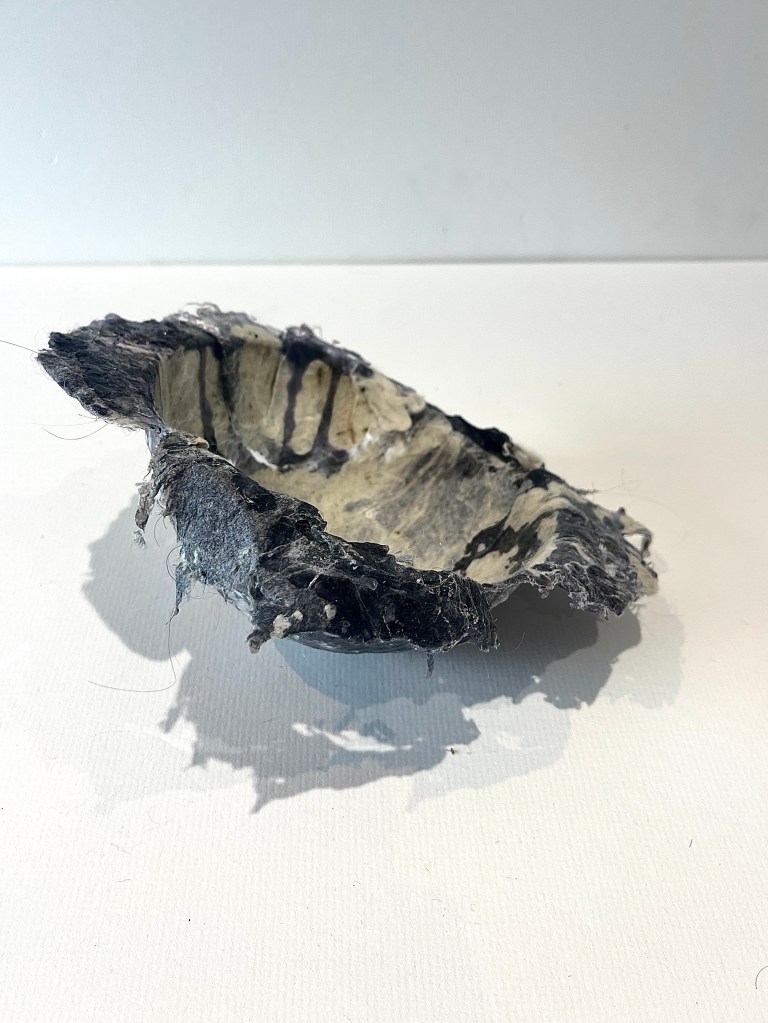 Part of the detritus exploration was looking to create objects from the machine waste in the home. Moulding and felting the material to create other objects from the ephemeral and fragile waste. The container or bowl shape is traditional in its structure and cultural ad historic meaning. It is a place to store and keep other items and is more often a item to eat food from.