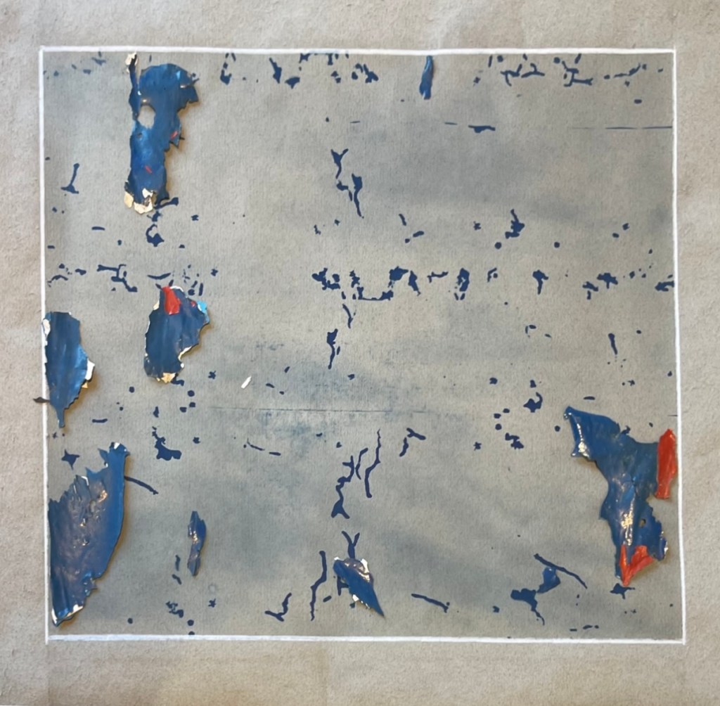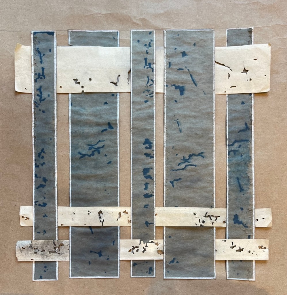 The work below uses cyanotype to explore the marks made in the paper. using them to imprint further images onto the found paper. The wobbly nature of the work is due to the undulating paper when photographed – they are in-fact straight blocks of printed cyanotype imagery surrounded by a white chalk boarder.