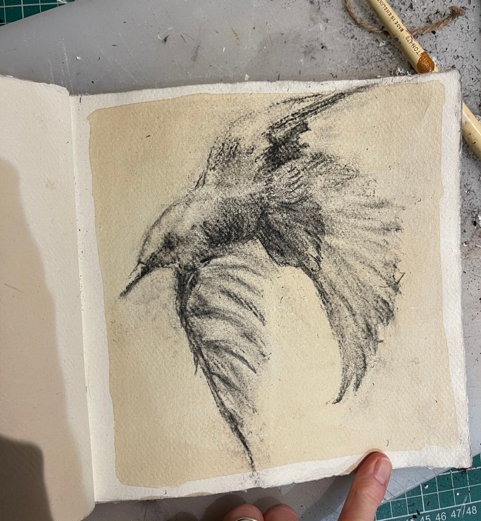 I also drew the starling and used thick layers of mixed media to emulate the travel and movement of the flight – bottom right. The b/w versions are photographed negatives of my work experimenting with colour and mood.