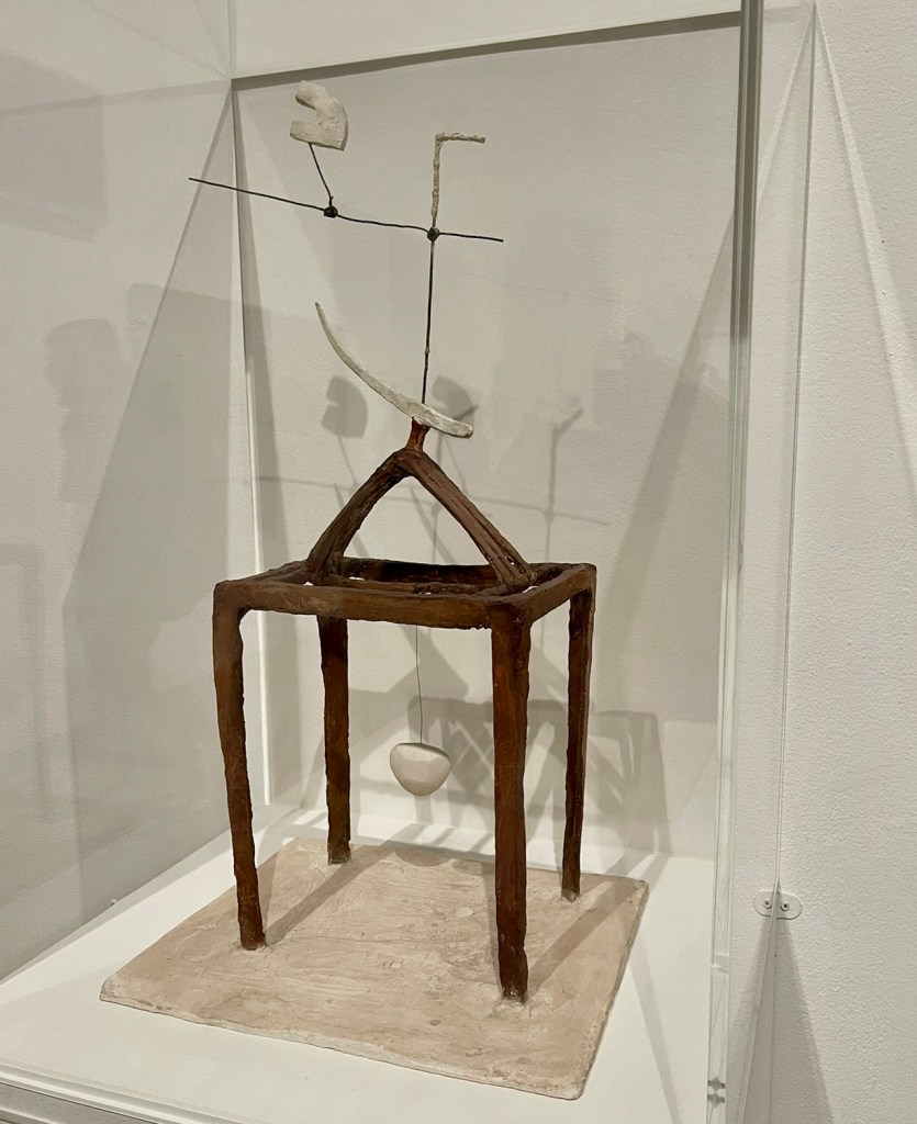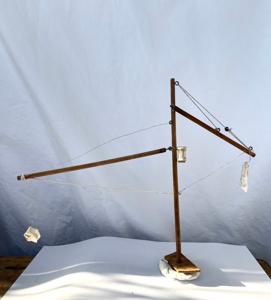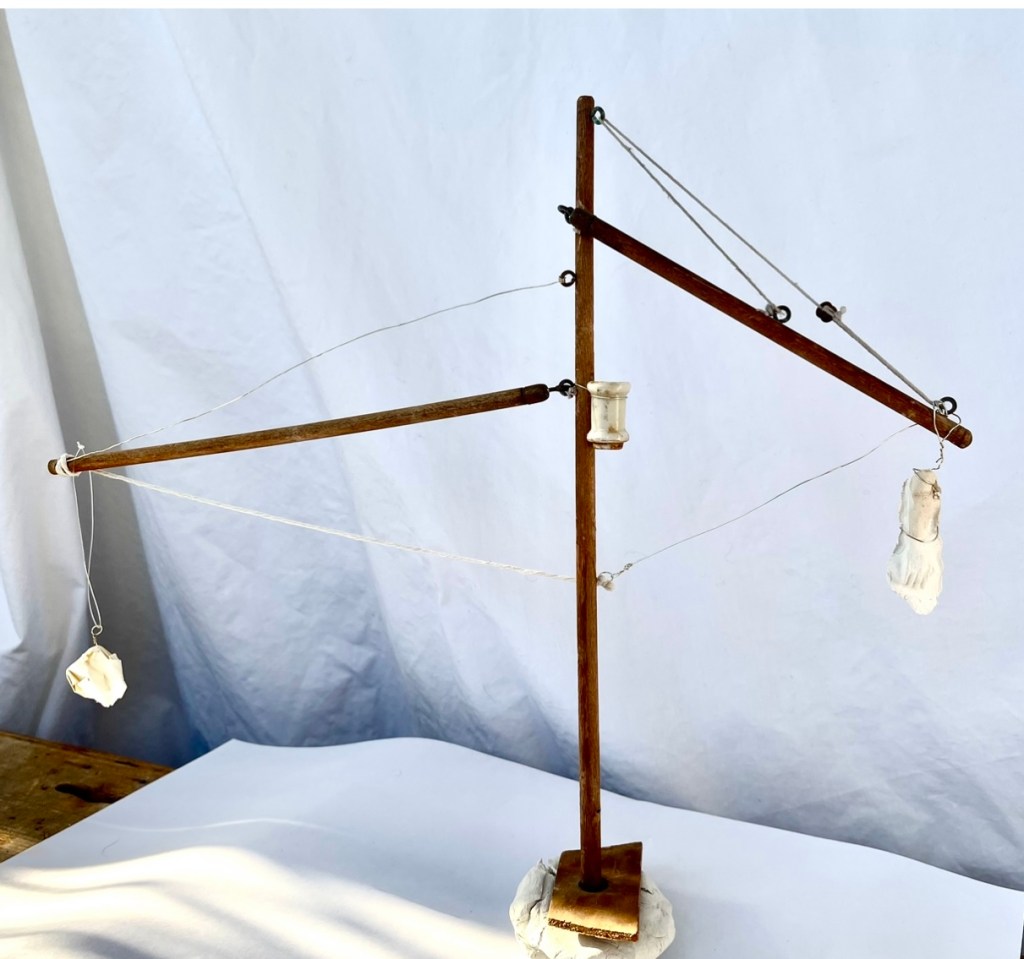 More ambitious was the potential for 3D sculptural project weighing up the multitude of pressures on women today, their multi layered role in society, its expectations, dilemmas and discrimination amongst others. This early stage model was in response to the juggling and balance a female faces with the muti-layered complexities of being. The wooded model is made from bits of an old model boat with a plaster cast of a dolls hand I had made, found objects denoting the role of provider and a weightless paper balloon I had constructed from paper using an origami method. It was inspired by a Giacometti I had seen at The Tate modern recently. I was drawn to its fragility, its balance its intrigue.