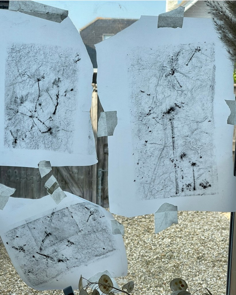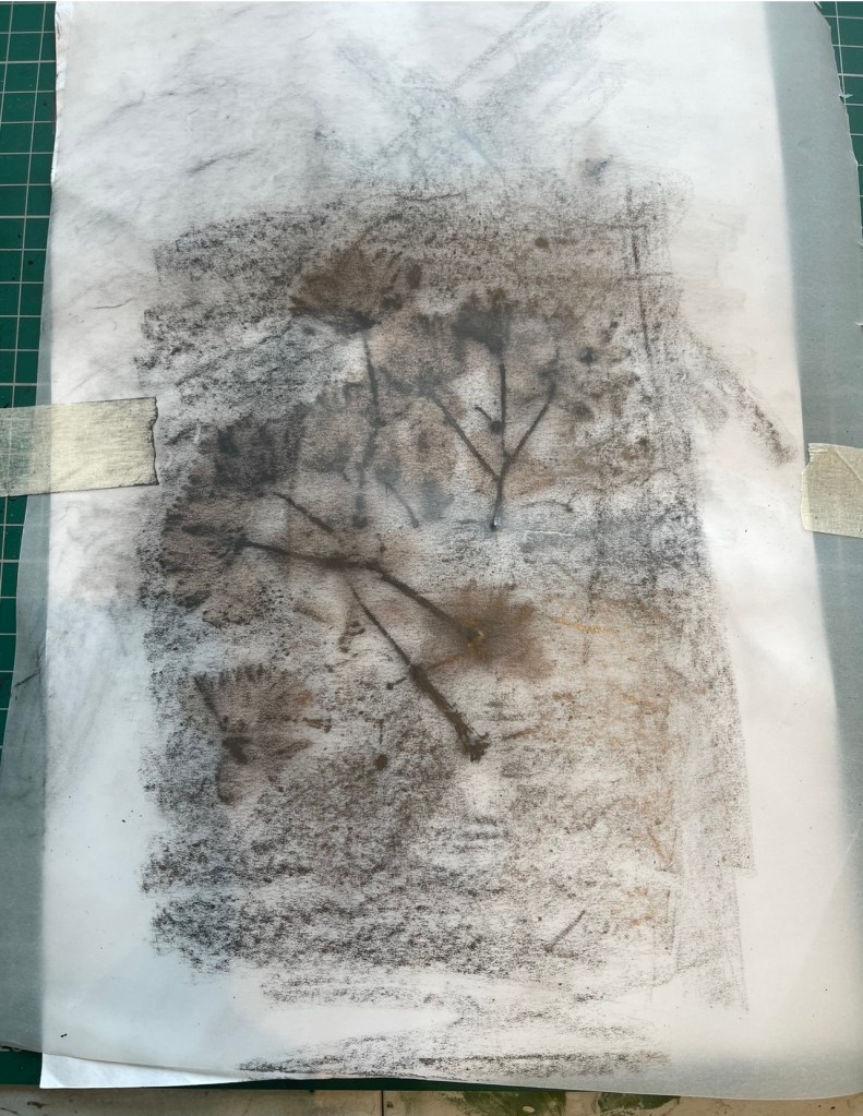 - ephemeral traces – dried flowers and frottage …looking at vulnerable surface, –