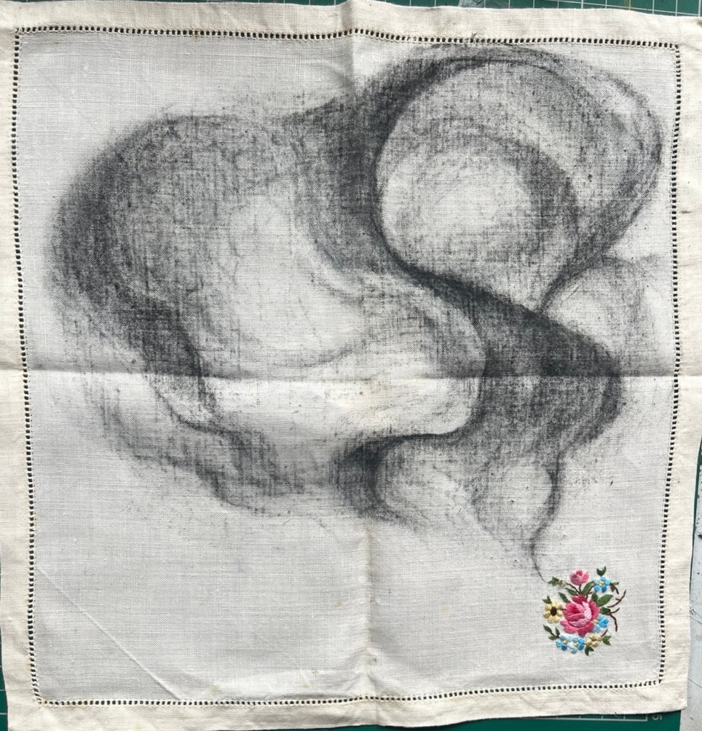 Playing with video – recreating the murmuration on a vintage embroidered napkin. The napkin is synonymous with the feminine ideal of the past …..a medium for further investigation…