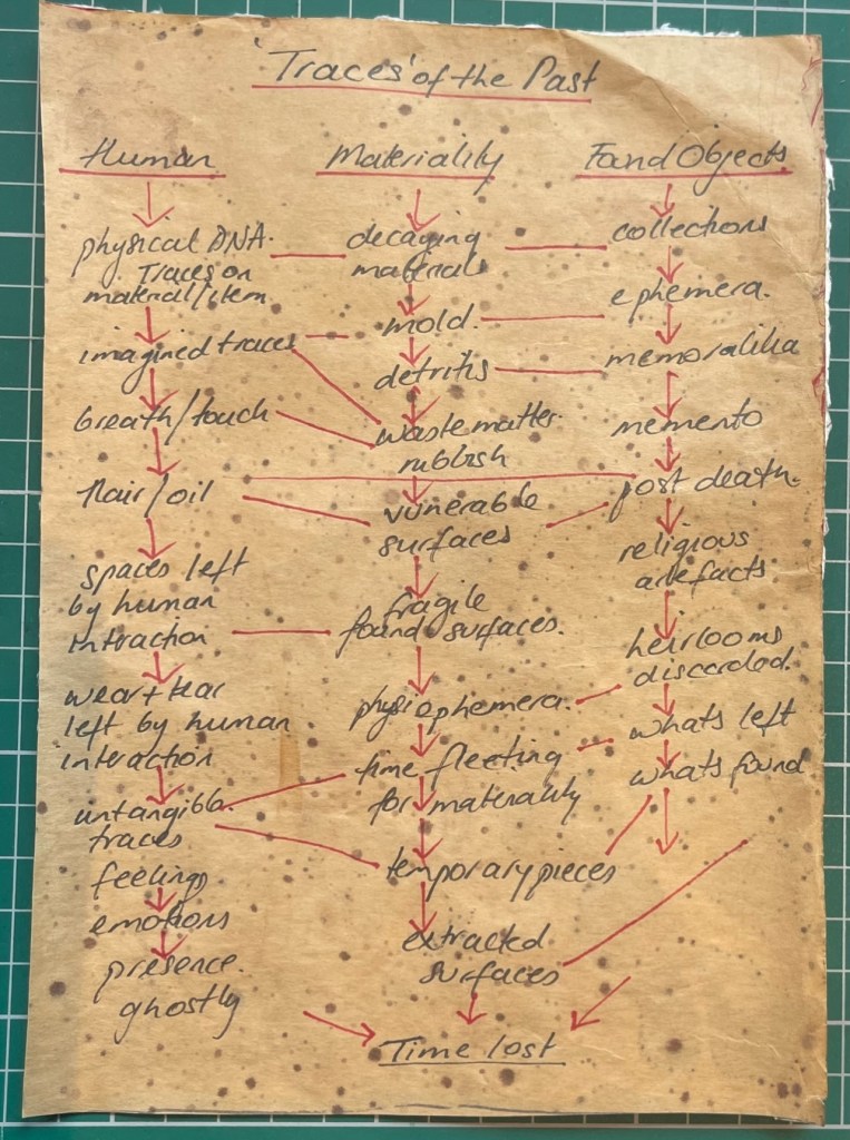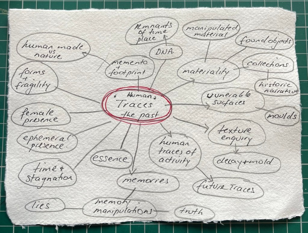 Using an array of found material ; ( see below – mind mapping project ) – I will explore found material, detritus, found objects, collections, vulnerable surfaces, remnants of the place to investigate the ephemeral traces of the past – looking at female issues concerning mental health institutions, working practices and past constraints and experiences using the found matter.