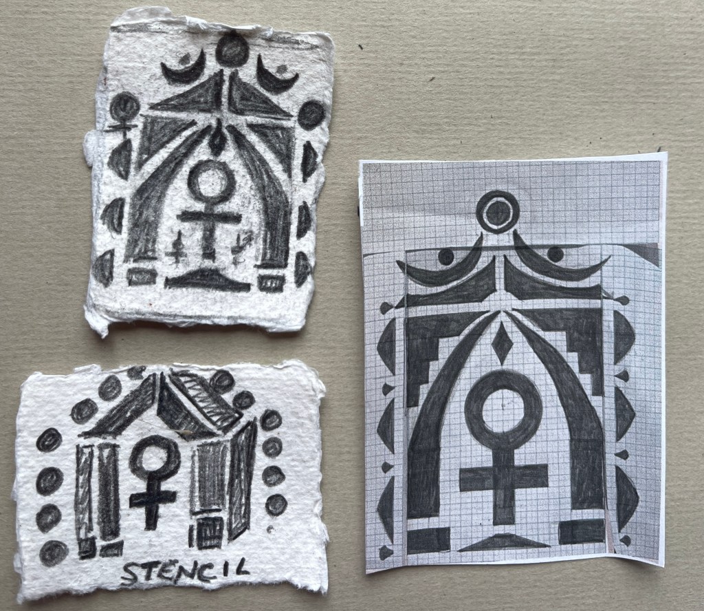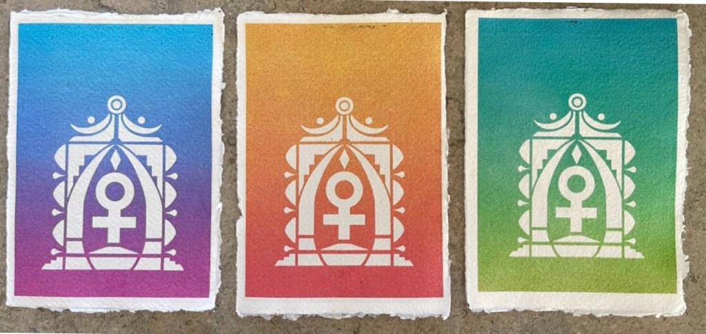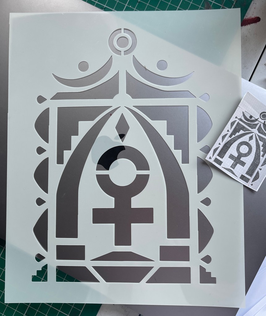 Shrines has been a newer concept that came from an idea through the work and research I compiled looking at Female Mental Health through the centuries. I found myself down the proverbial rabbit hole online reading fascinating, and often hardly-known stories of women from the past. Despite gaping cultural differences, there was always a story of bravery, survival, a move ‘against’ the patriarchy and generally overcoming mountains. These stories of common themes were global and shone a light on the power of the female and the multi-faceted and complex role we play in the world essentially dominated by a male powerhouse. Further research led me to the various Archaeology sites, the British Museum and other worldwide Institutions that catalogued and documented the role of the female from ancient times. Once considered the stronger of the species, able to reproduce, feed her young and bleed without dying or injury, the Female was worshipped and venerated. Some of our most ancient artefacts are in fact small female goddesses or deities. The Romans/Greek civilisations were some of the first to break with this tradition and project the powerful hunter, fighting male into the forefront depicted initially as the God of Gods, Zeus, where the male has pretty much stayed. Shrines is a full and unabashed celebration of the female, and all that identify with her. I was surprised to see there was not a direct non-secular, non culturally specific Shrine to the Female in my research. I note Judy Chicago, The Gorilla Girls and other female artistic activists over the years have played a prominent role in bringing the strong image of the female to the forefront. I would like my work to complement this in a’ stamp’ of praise, a simplistic image, a selection of images or 3D traditional shine structure that is instantly embracingly connective with all females. I expect a 2 D and 3 D series of works will come from this thought process. My initial work on a strong image or ‘logo’ for this is below… using the universal sign for female, with a plethora of ideas to expand upon. Considering some anonymous washable graffitti for this this – photgraphing each site – relevant to perhaps the patriarchy / male dominated areas, establishments… etc