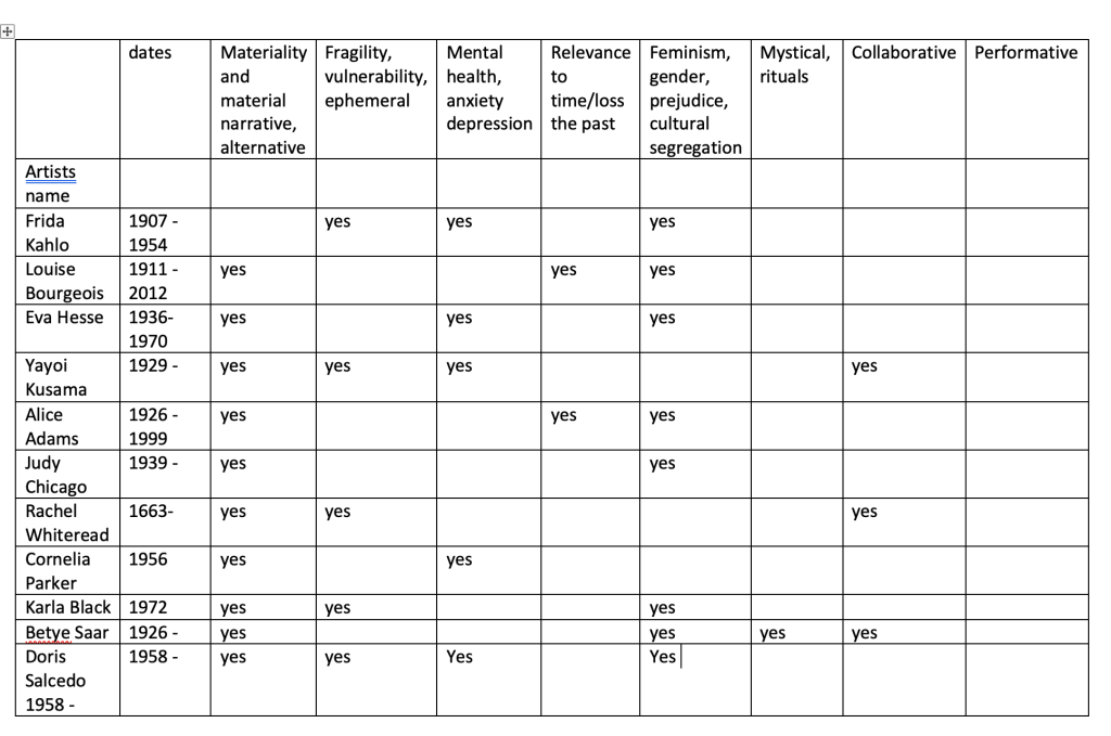 I will consider how and why artists Doris Salcedo, Mary Kelly, Karla Black, Catherine Bertola and Louise Bourgeois practice speaks to my own and enquiry and practice.) How do the artists relate to each other – themes threads, practice ?