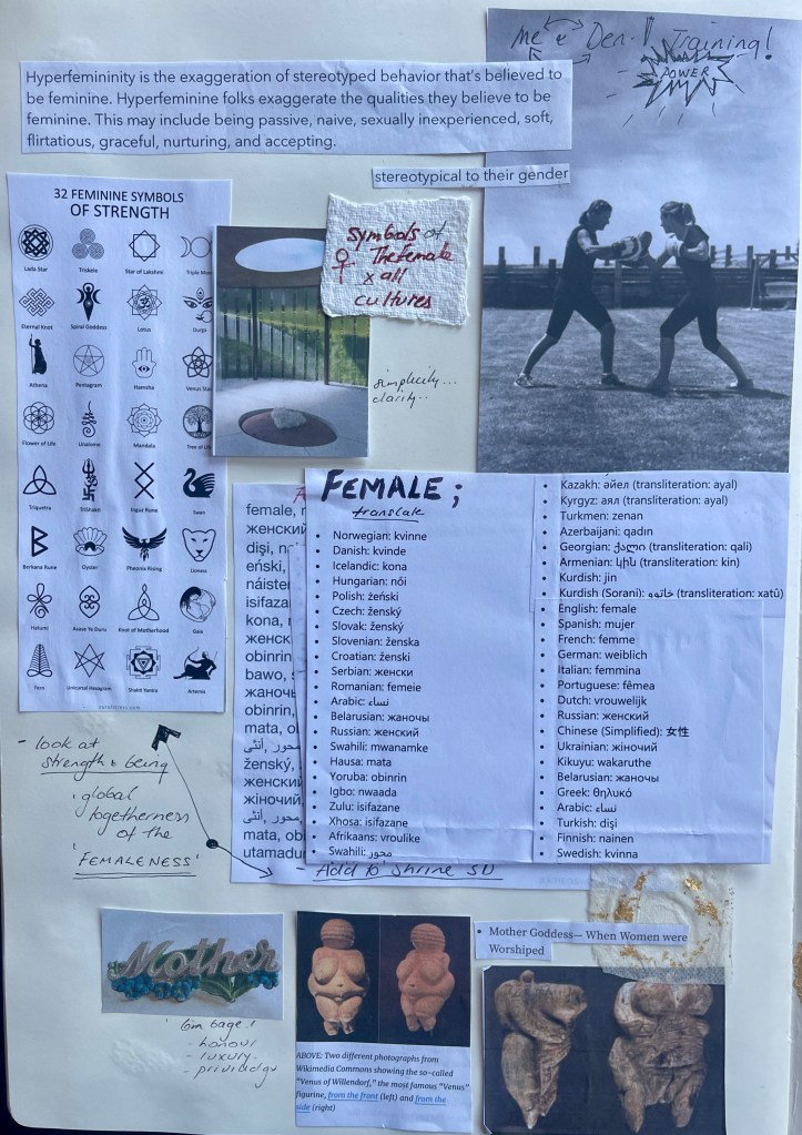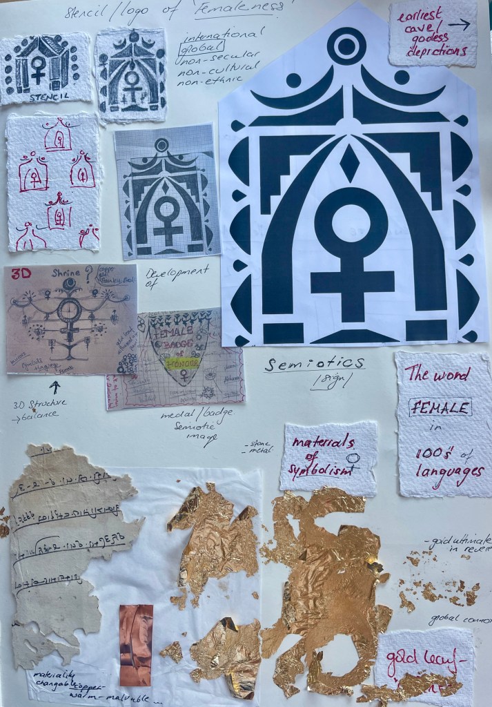 Creating a non-secular, cross boundaries work to ‘venerate femaleness’ within a possible shrine like setting encompassing the language of 100’s of countries, semiotics and symbols to allow a global admiration, honour and respect of ‘femaleness’. Will I able to pare down the theme of ‘femaleness’ and arrive at a place full acceptance, understanding and acceptance by all humans?
