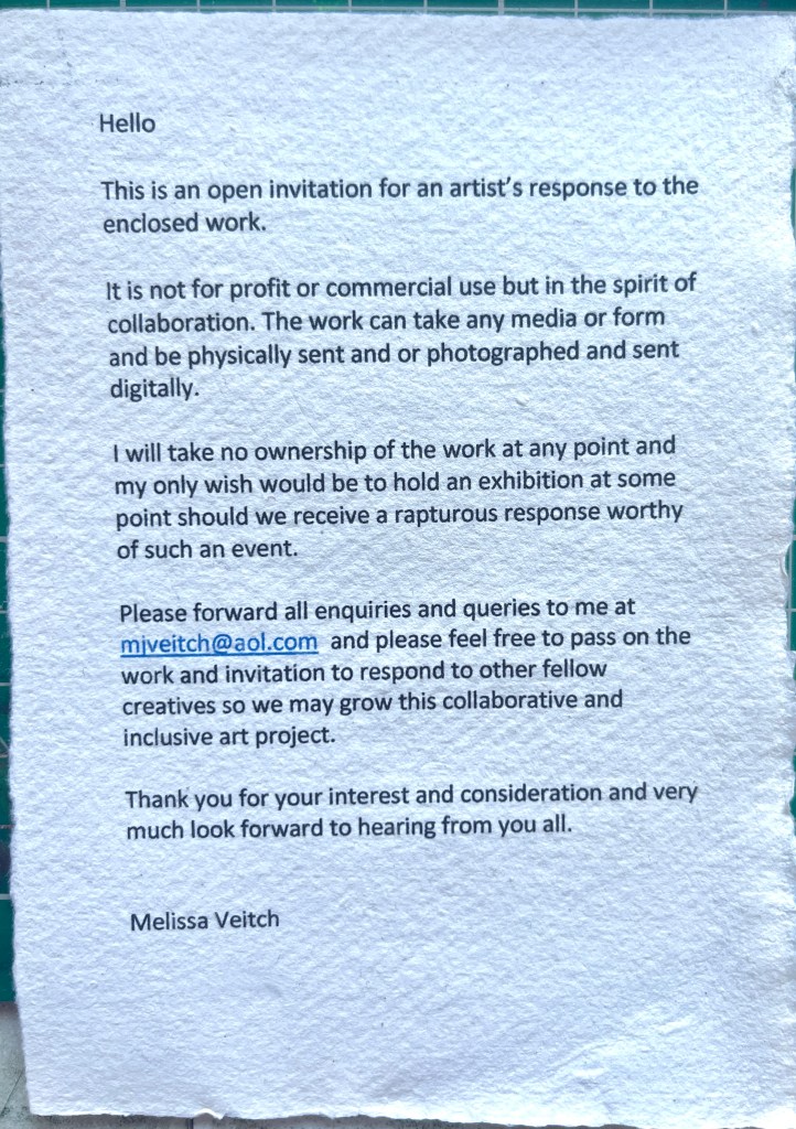 2. Participant work / Collaborative work – potentially looking at artist response feedback to Veneration Project – art work produced by fellow artists in response to sending out my post card sized art work. This will be confidential and anonymous if required by the participant.