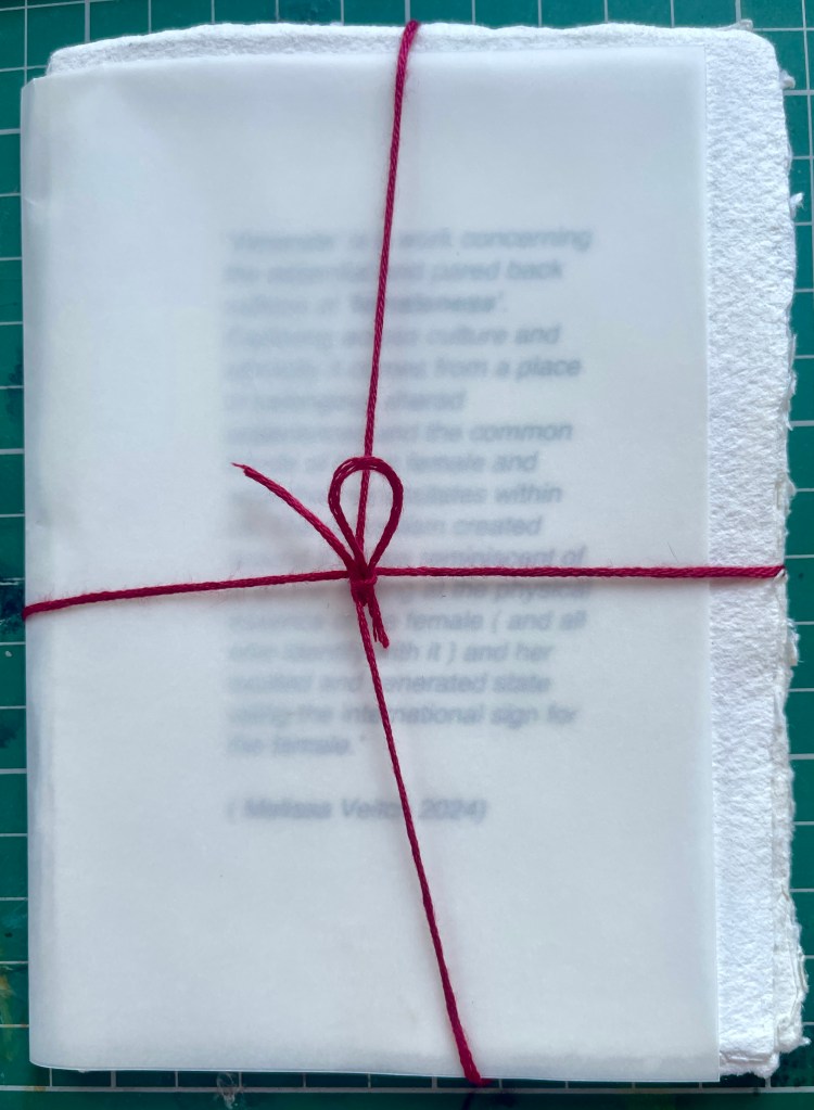 Printed on Khadi paper they are postcard in size and purpose. My aim was to create a collaborative group of works – (ideally and exhibition on day )inviting artists to explore the notion of ‘femaleness’ and it meaning.