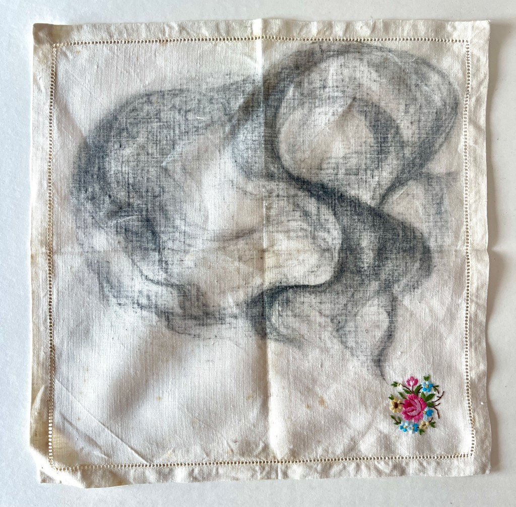 Bedding and shrouds are prominent in art most famously Tracy Emin’s ‘My Bed’ (1998) perhaps using bedding as a canvas for the work could be pertinent. My exploration in to vintage objects such as embroidered napkins also bring with them a narrative of past lives and constraints. I am also keen to look at common every day objects to replicate this imagery in an attempt to inform the viewer of the underlying anxiety and worry carried through out the day.