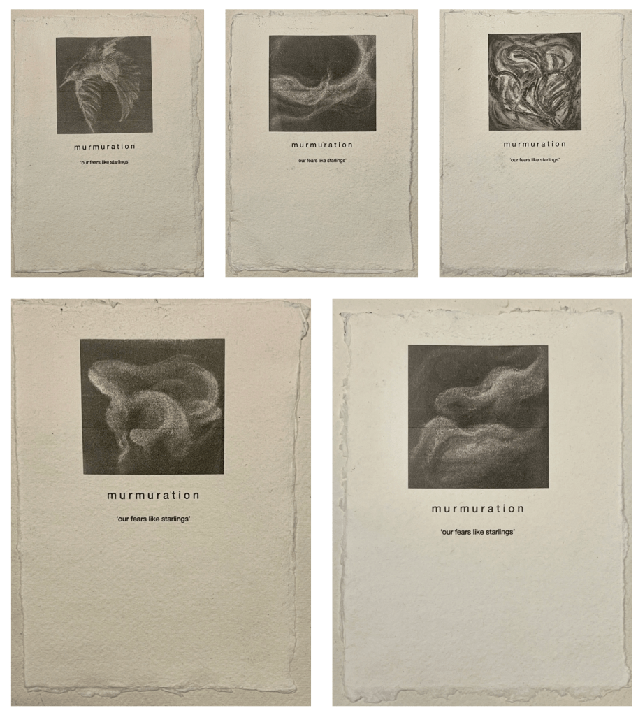 The visual impact of a starling murmuration is a awe inspiring natural phenomena that occurs at early evening/dusk just before the flock come into roost. Thousands of these small birds create vast sweeping, undulating and flowing shapes across the sky. There is an eerie sound of the thousands of wings in flight all strangely and curiously synchronised and almost moving as one. This image combined with a line from a poem “our fears like starlings..” (sadly now lost to me) brought about strong feelings of connectivity and understanding.