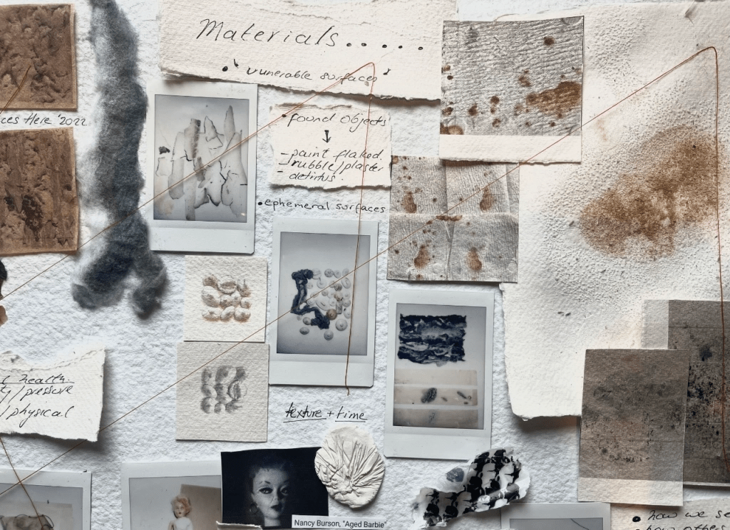 Rethinking and re-evaluating and going back to my original passions in regards to materiality and the found material – adding this dimension to my work as part of a a narrative of issues concerns explored, ie, femaleness, female mental health and time/decay what is abandoned, saved, lost.