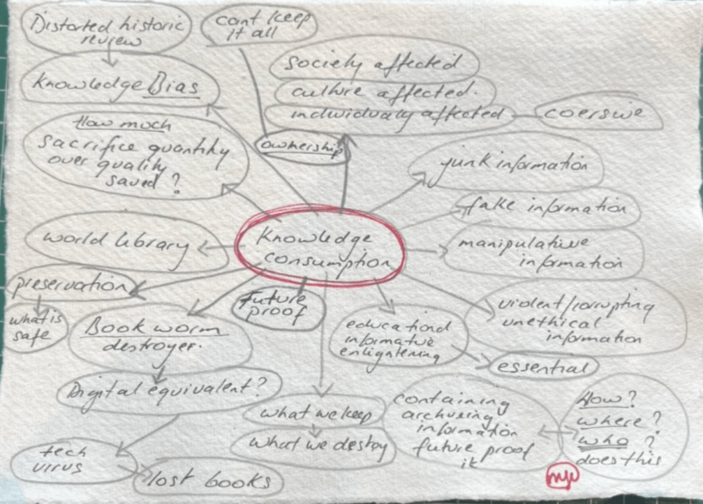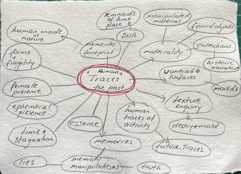 Valuable early mind mapping showing material enquiry of ‘detritus’ top left.