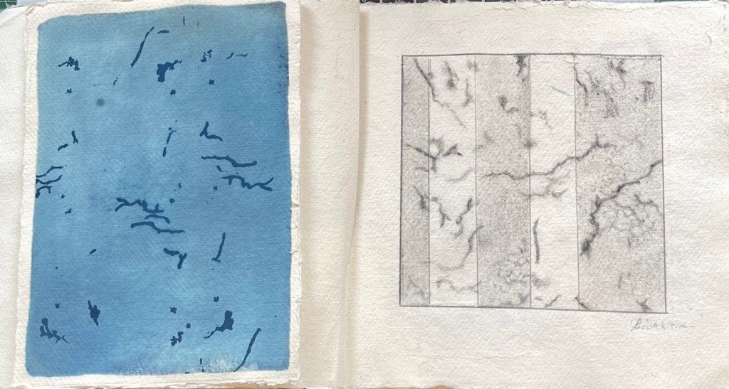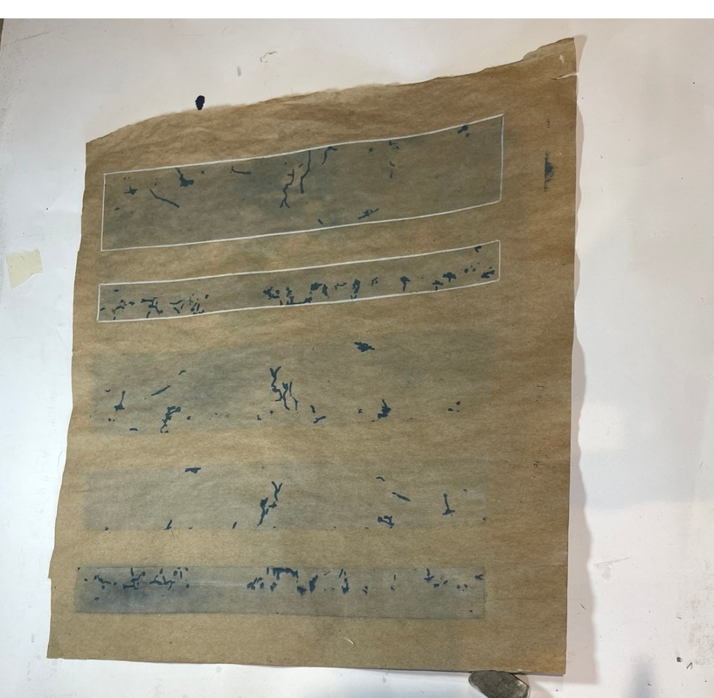 I wanted to record the markings in some way – to document them in another format – other than their own them. They were in a way a perfect stencil so the cyanotype work I had previous success with seemed to be an initial way of documenting: