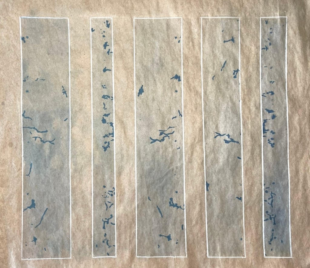 I manipulated the strips of paper to form varying design options: This one below on a sheet of A3 found brown paper from some packaging also retained some of the washed out blues of the cyanotype – It has a strong Japanese feel to the work with its elongated triptych qualities and simple wood block feel. I drew around each strip with a white chalk pencil to highlight the colours and shades of the cyanotype and the ombre effect.